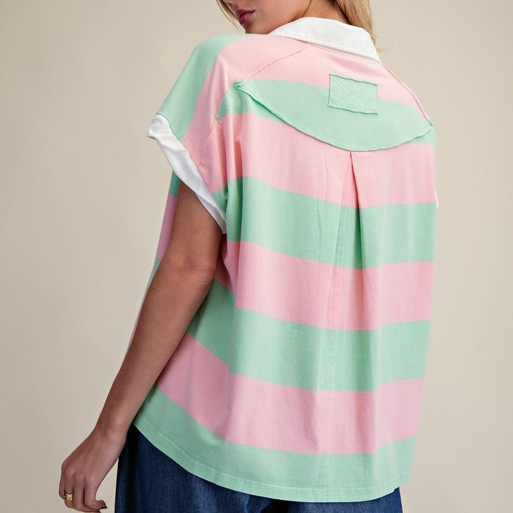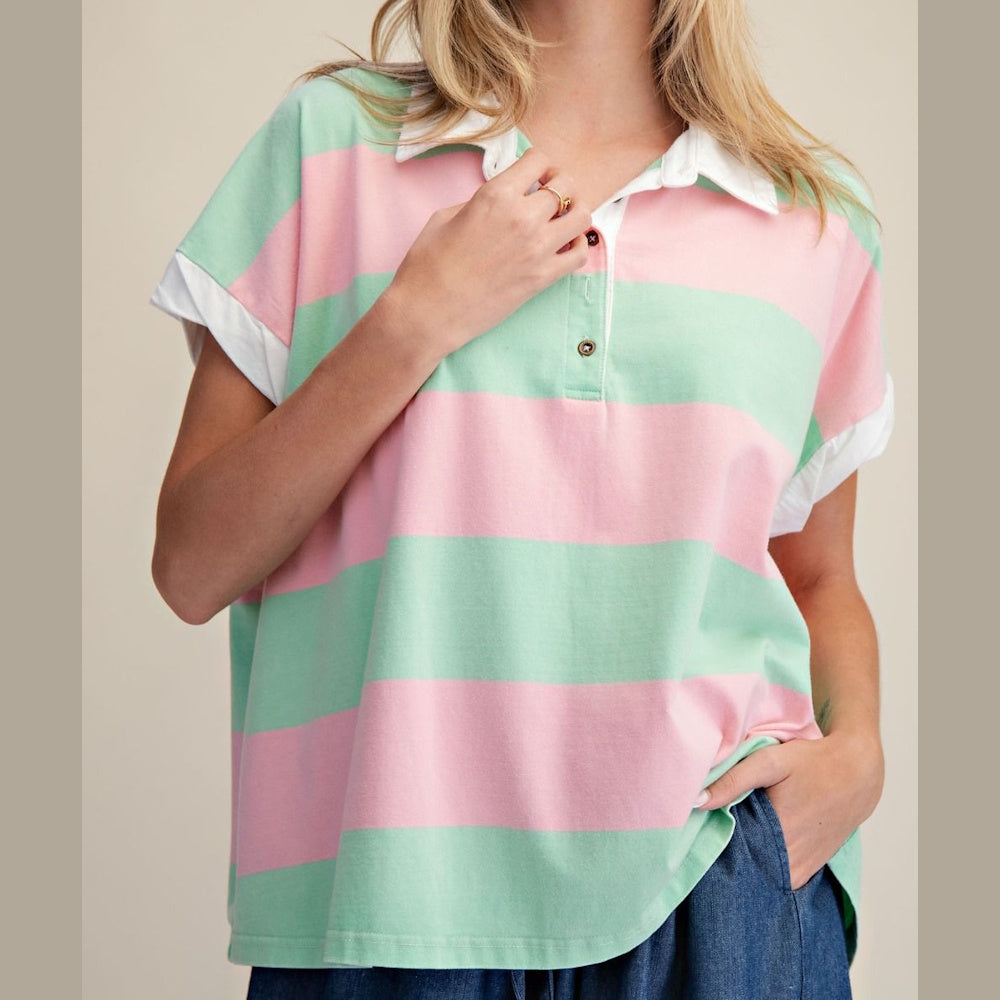 Add a touch of classic sporty style to your casual wardrobe. Shop the Rugby Stripe Washed Henley Top by Easel today at MISS DAISY'S Home & Decor and enjoy effortless everyday fashion.