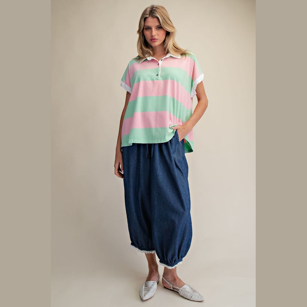 Bring relaxed vintage charm to your everyday wardrobe with the Rugby Stripe Washed Henley Top by Easel. Featuring classic rugby-inspired stripes and a soft washed finish, this top delivers casual comfort with a stylish, laid-back edge. Perfect for effortless outfits, it blends timeless design with the relaxed aesthetic Easel is known for.