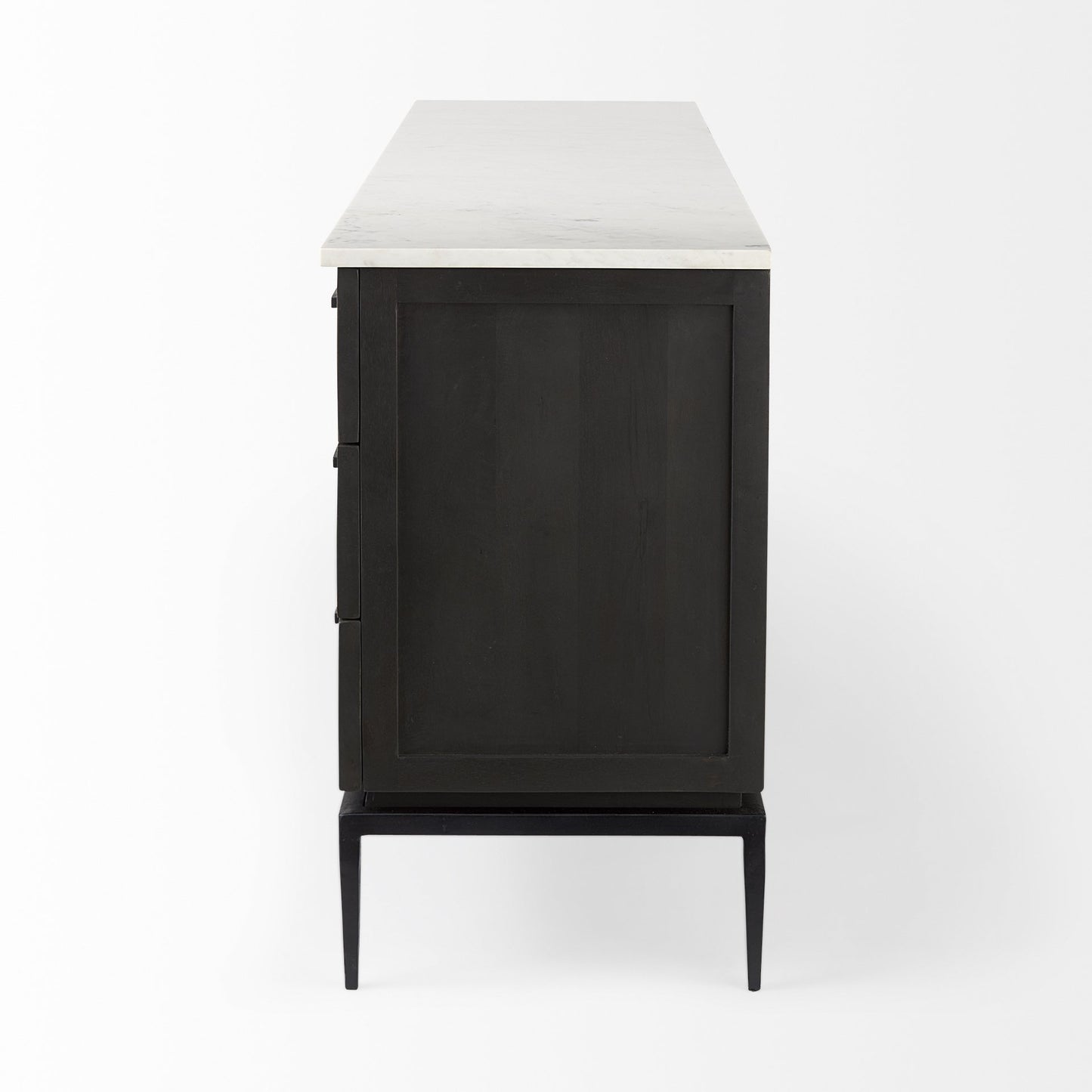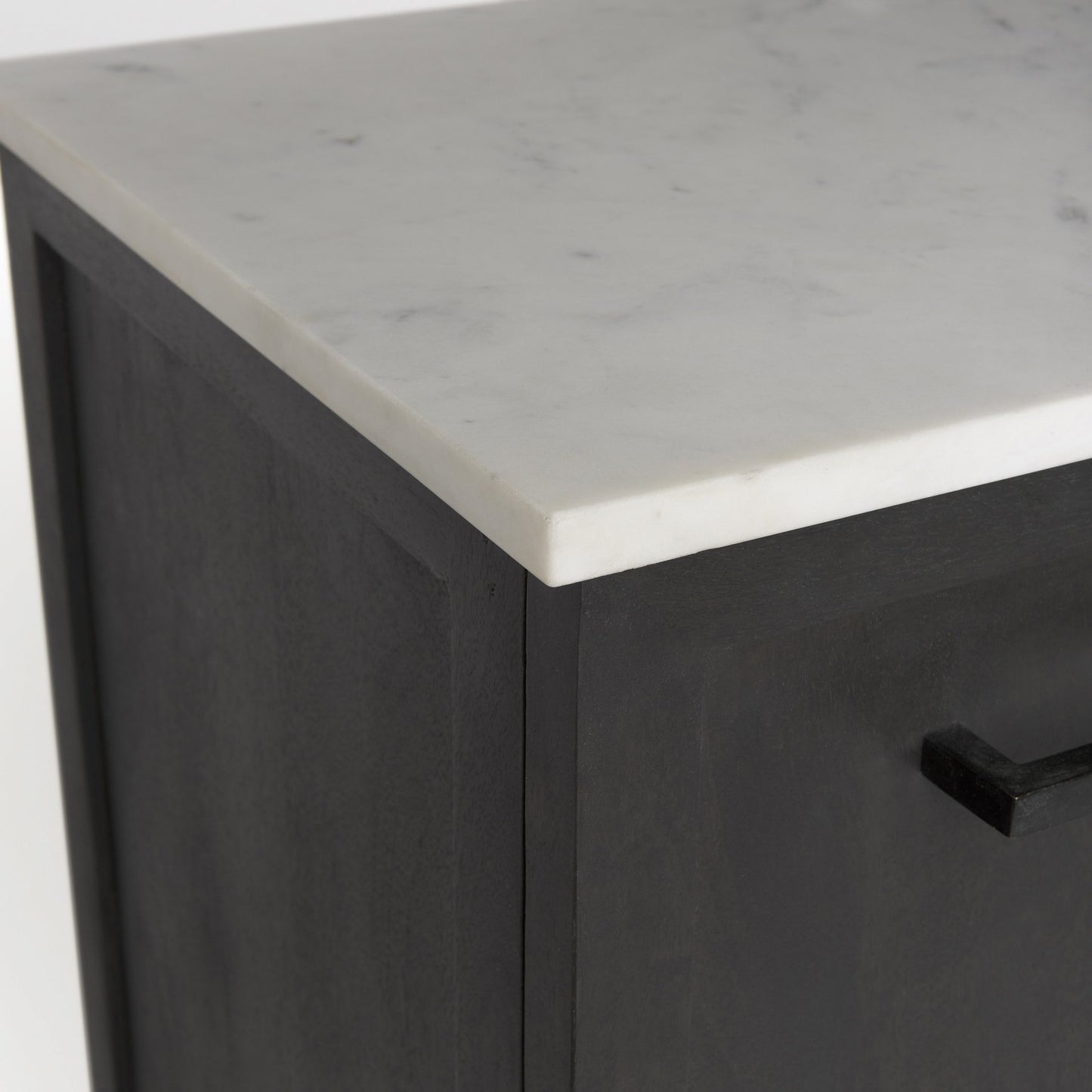 Fall in love with the marble top, the solid black-brown mango wood, and the sturdy iron base. This beautiful sideboard boasts two cupboards and three drawers – ample space for secreting away essential items.