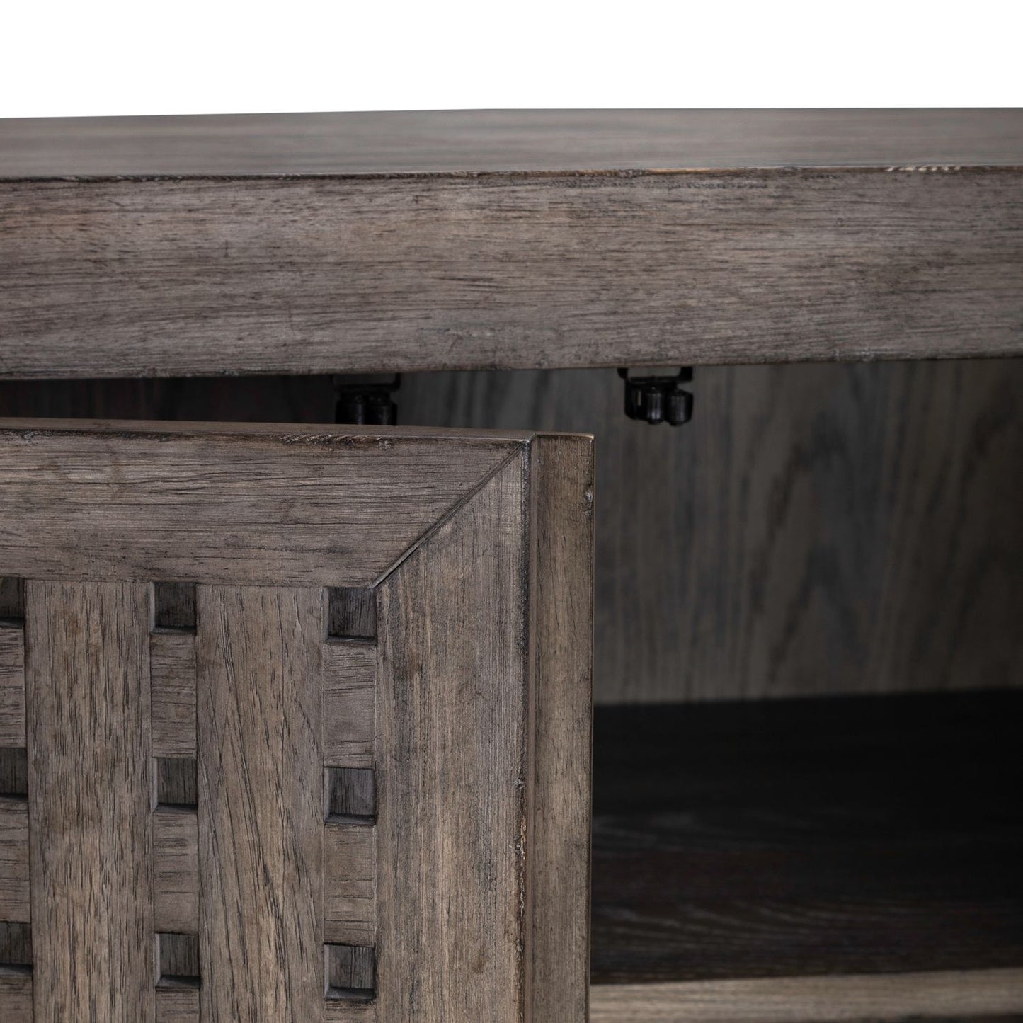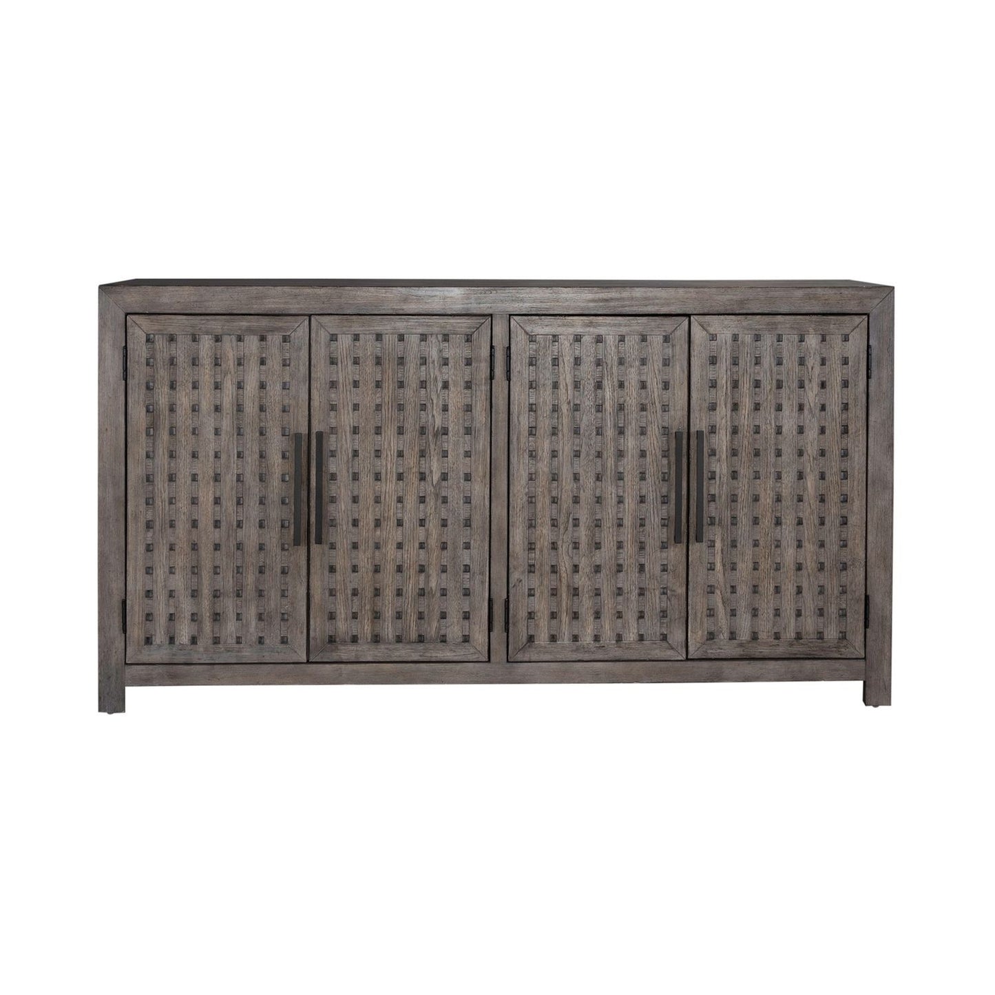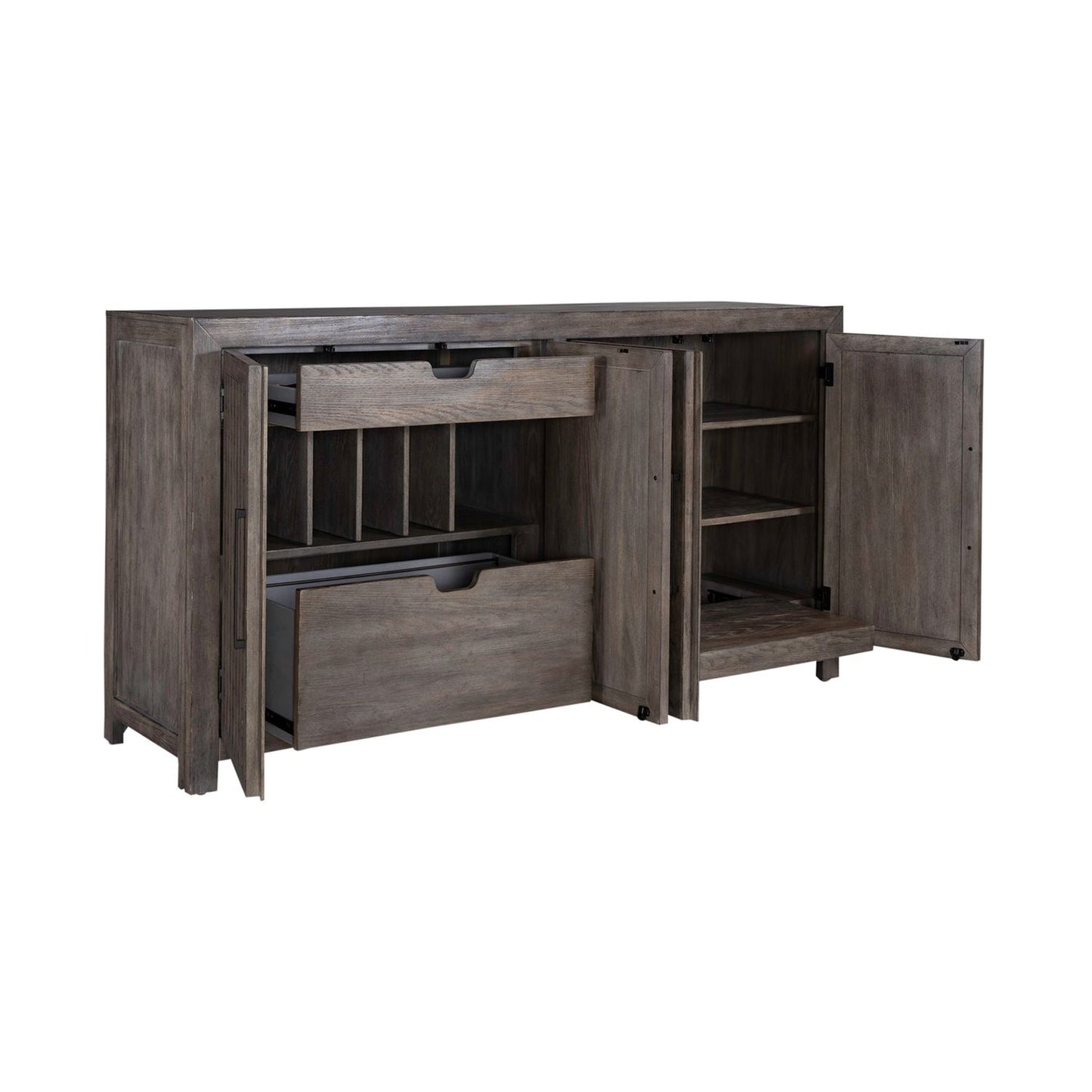The accent buffet has four lattice doors that are sure to attract attention. Located behind one set of doors are two full extension drawers and multiple storage compartments. The top drawer is felt lined while the bottom drawer is large and offers deep storage. The different storage compartments can be used to keep things separated and organized. Behind the other set of doors are two adjustable shelves and a full extension pull-out shelf with wire management access located behind. Feel comfortable and elegant at the same time with the Winslow accent buffet.