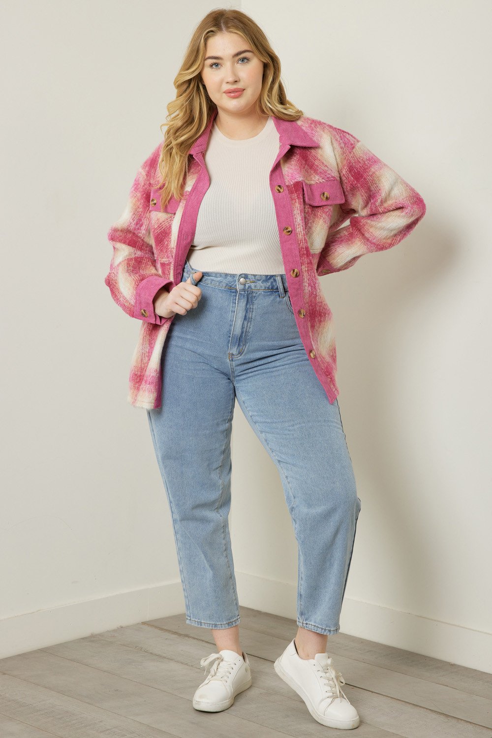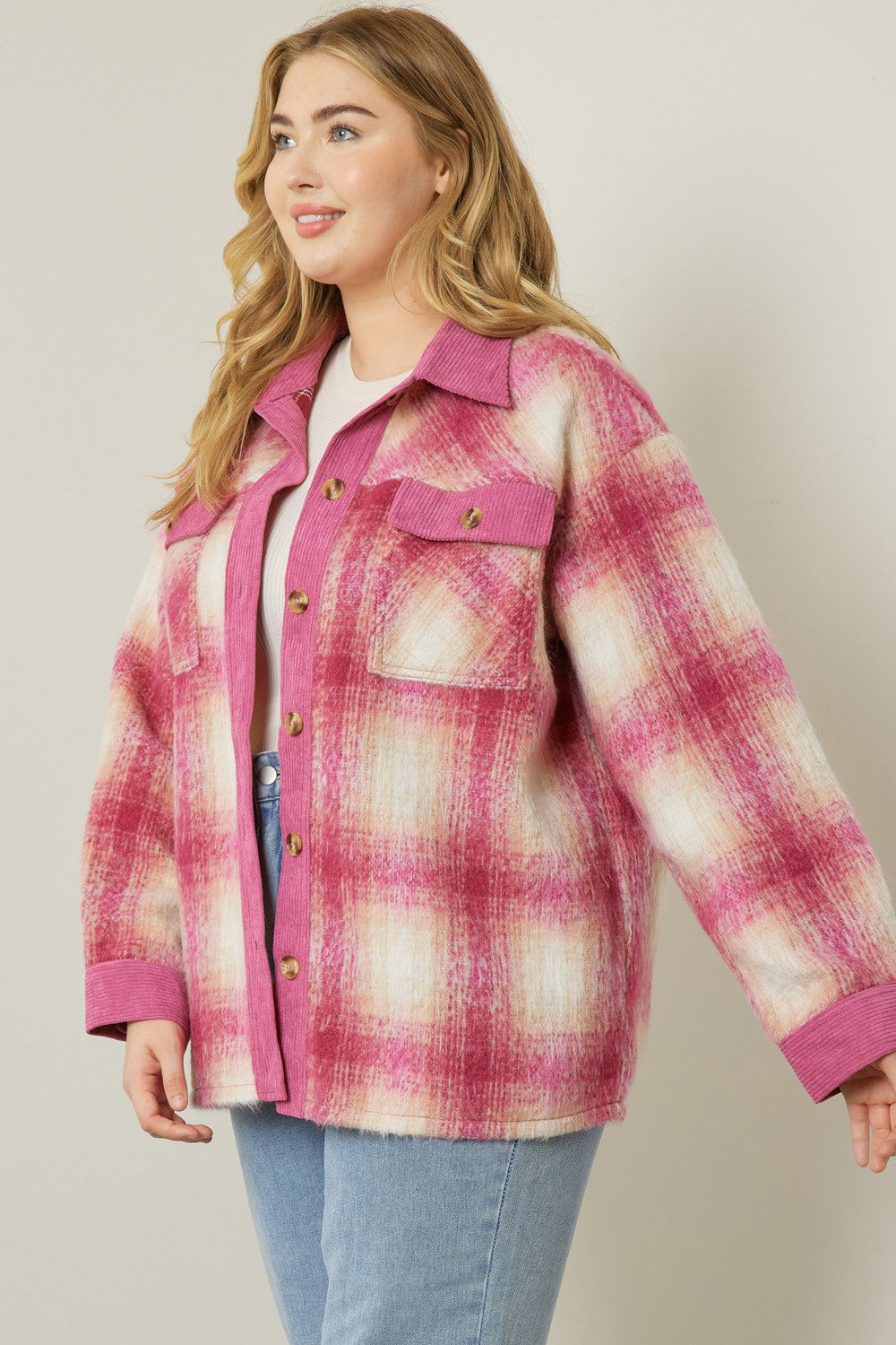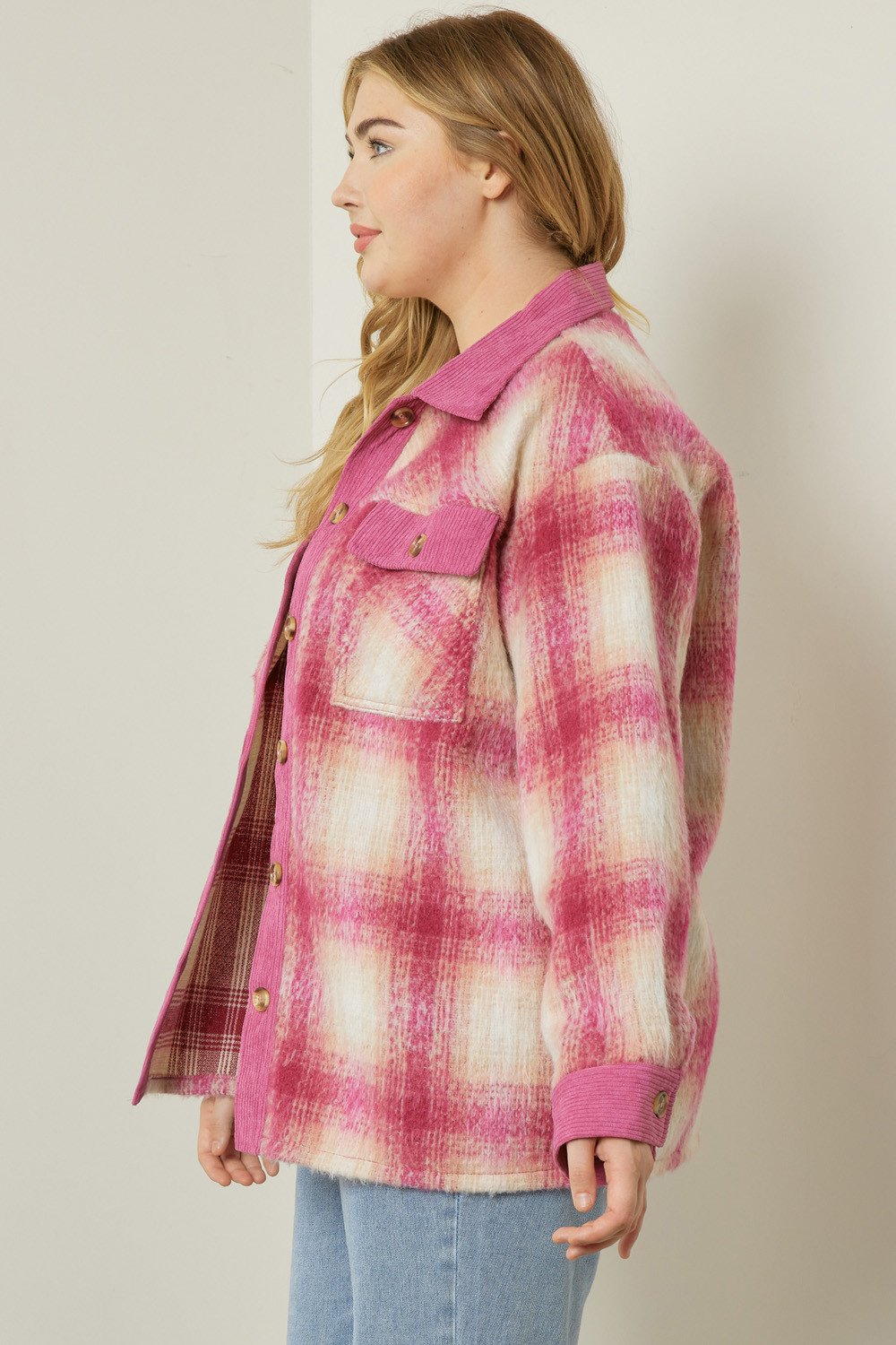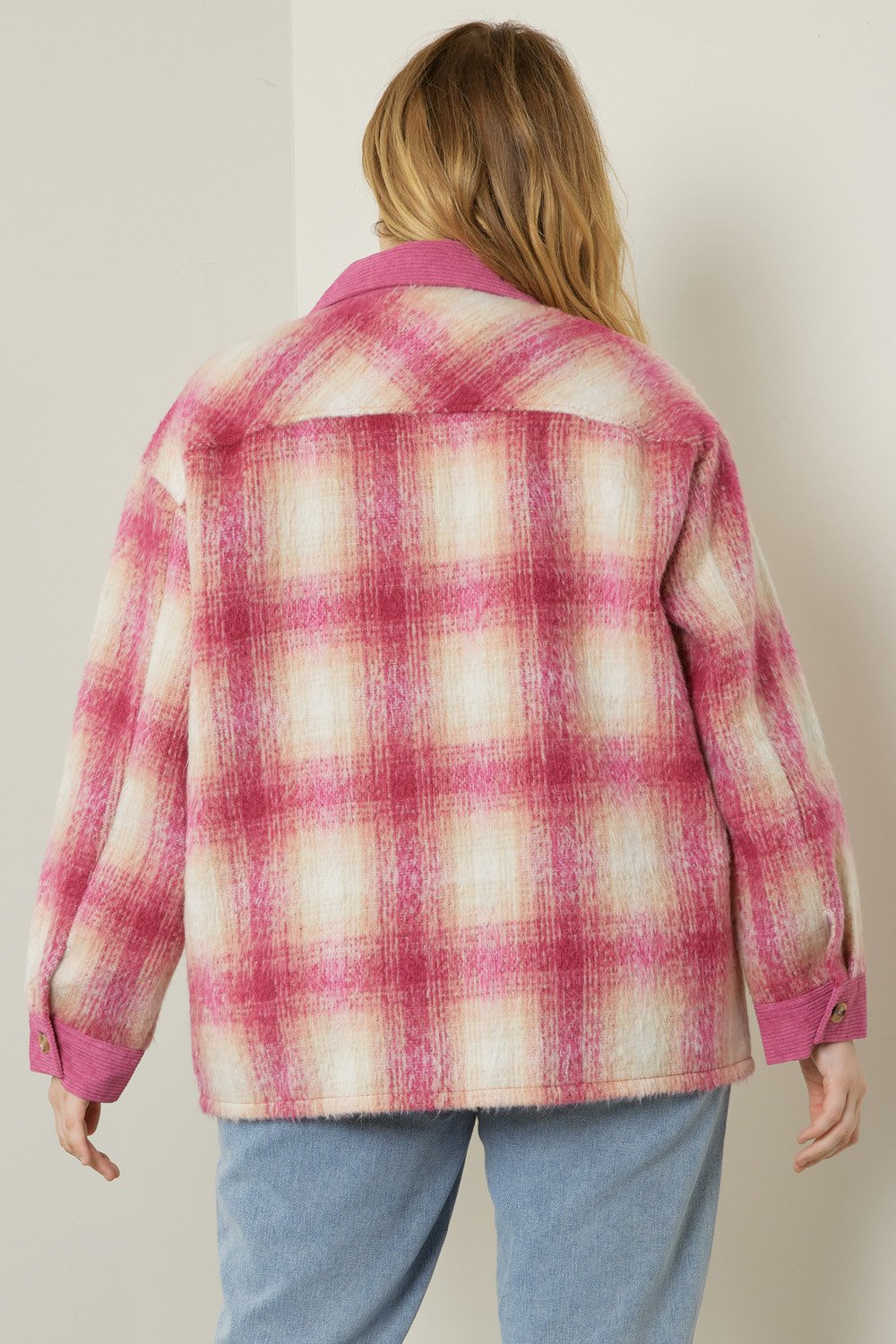 Plaid collared button up jacket featuring flap pockets at bust. Button closure at sleeves. Unlined. Woven. Non-sheer. Medium weight.