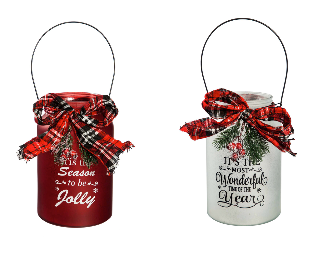 White LED Jar with Plaid Ribbon, Pine, and Berries