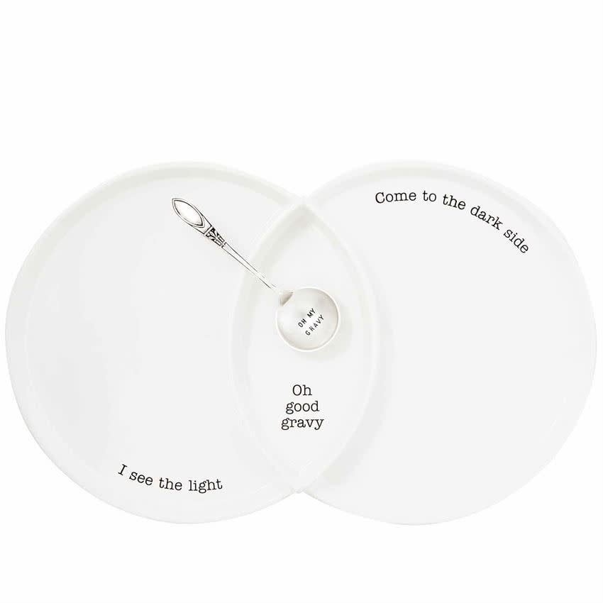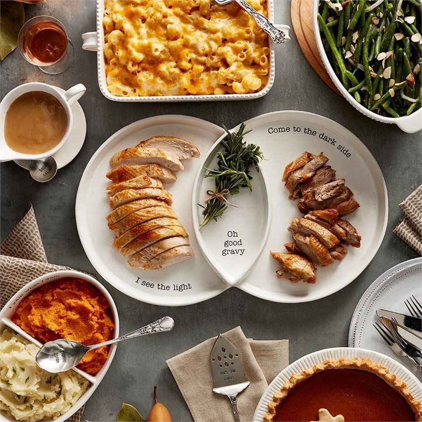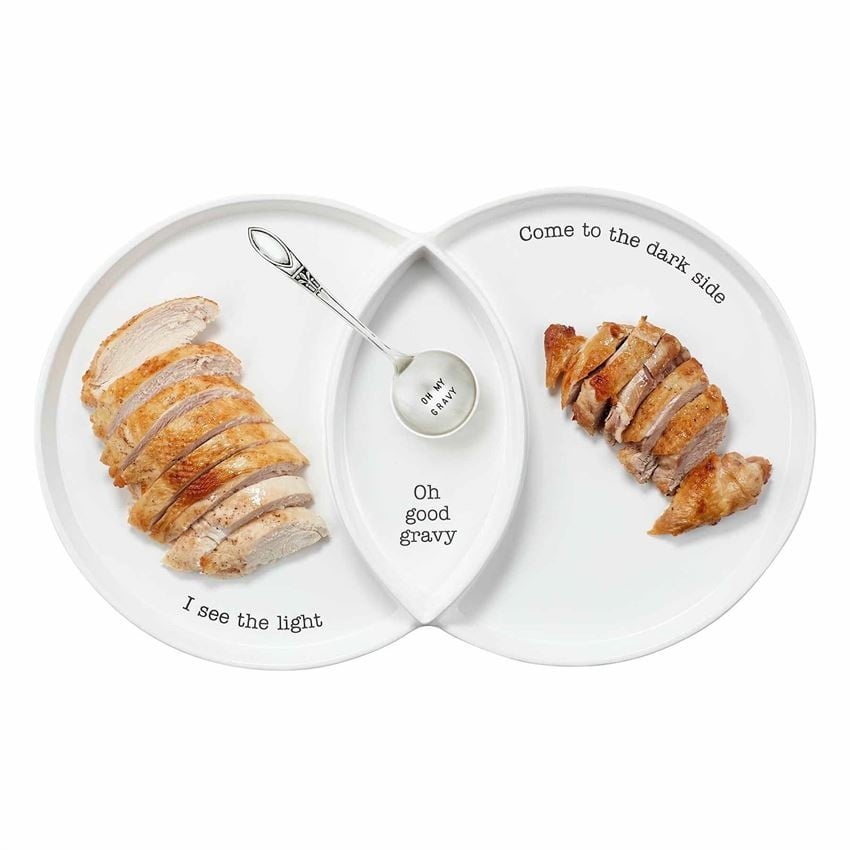 2-piece set. Divided three-sectioned turkey serving dish holds dark meat, light meat and gravy in center dip well. Arrives with silverplate sentiment spoon.