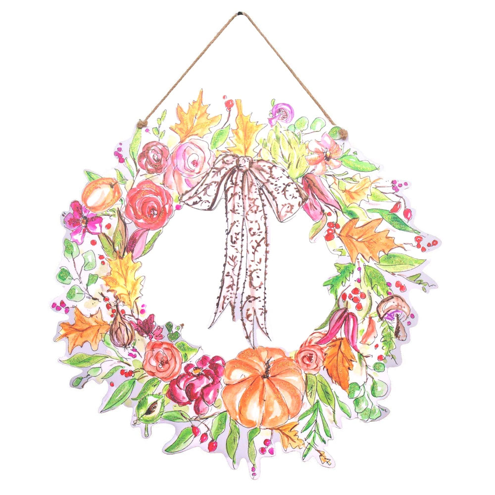 This hand-painted, durable PVC wreath combines festive pumpkins with delicate roses for a charming autumn display.