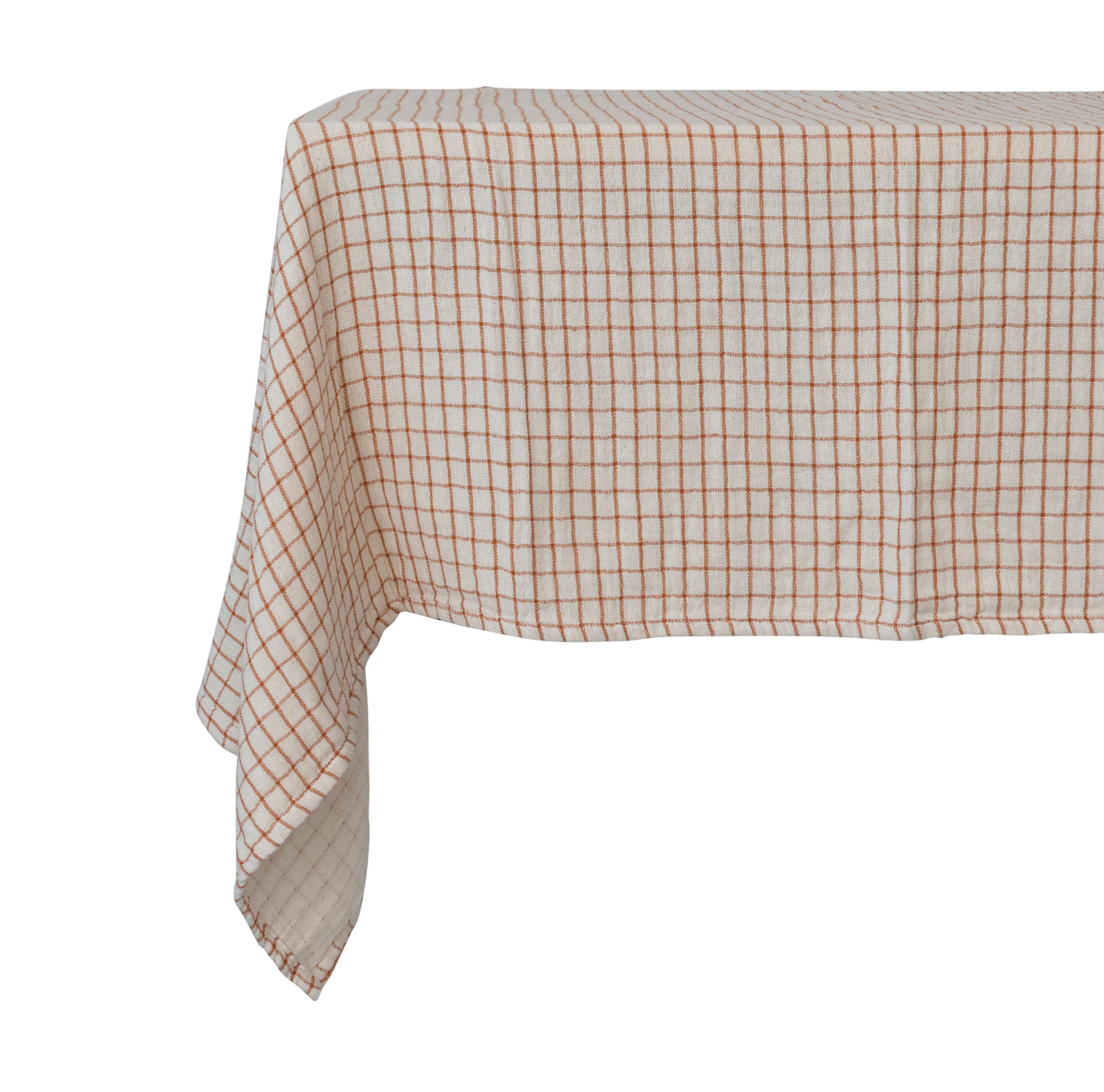 Cotton Double Cloth Tablecloth with Grid Pattern, Natural and Rust Color, 90"L x 70"W