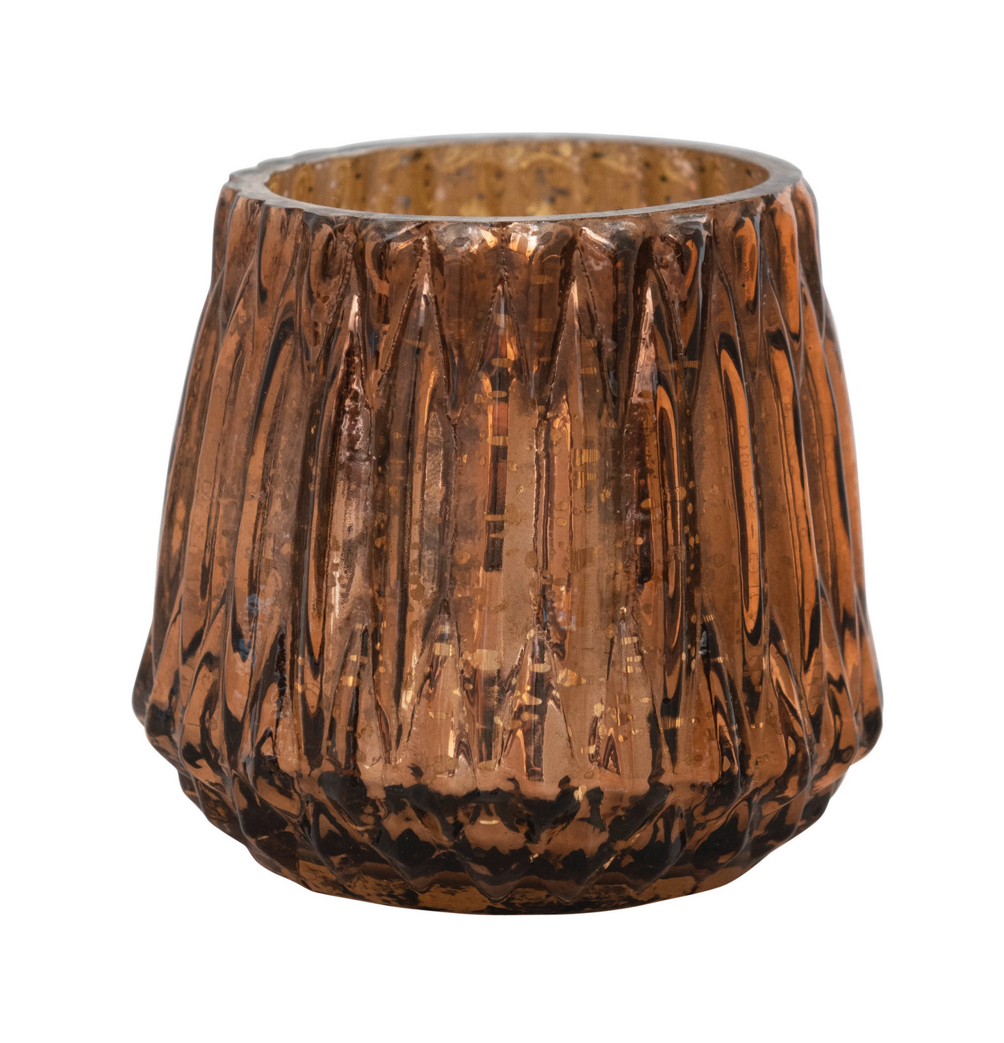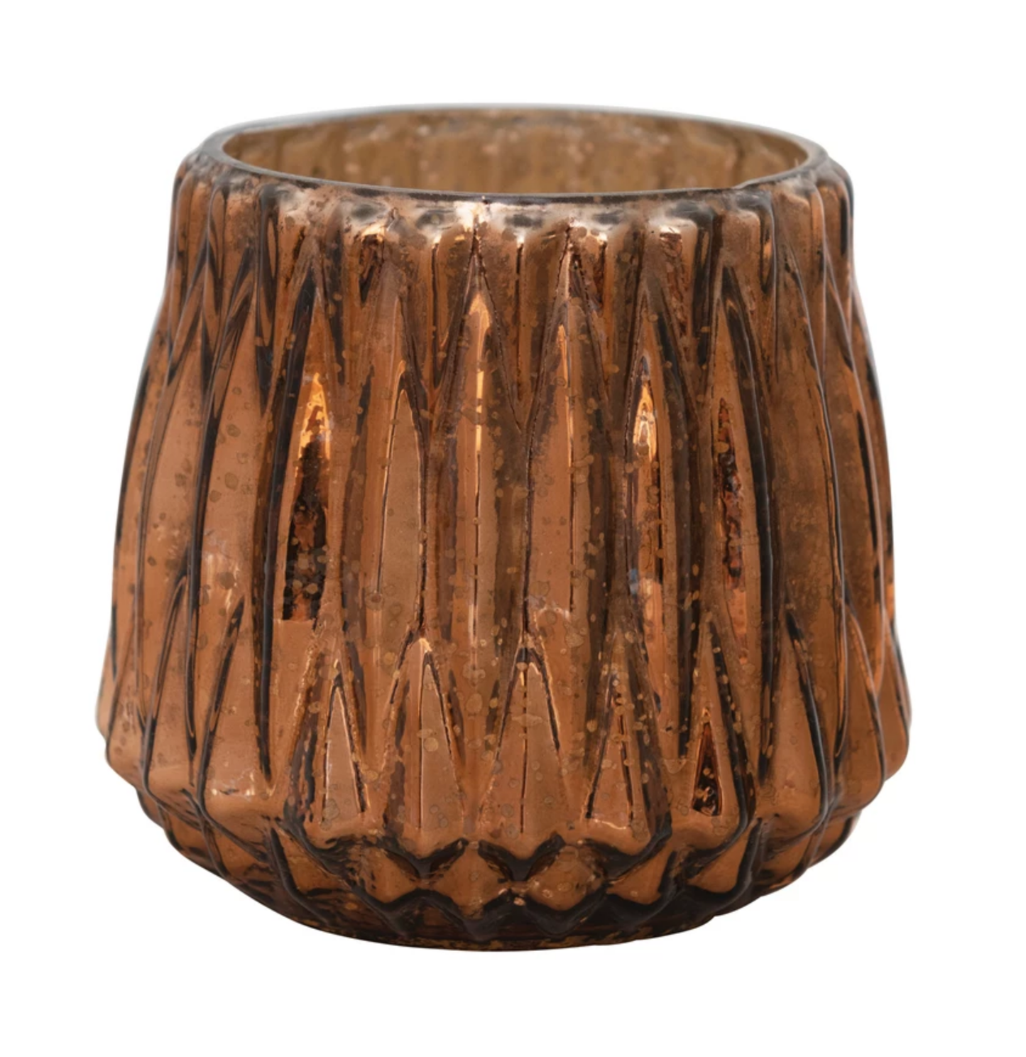 4-1/2" Round x 4"H Embossed Glass Votive Holder, Copper Color