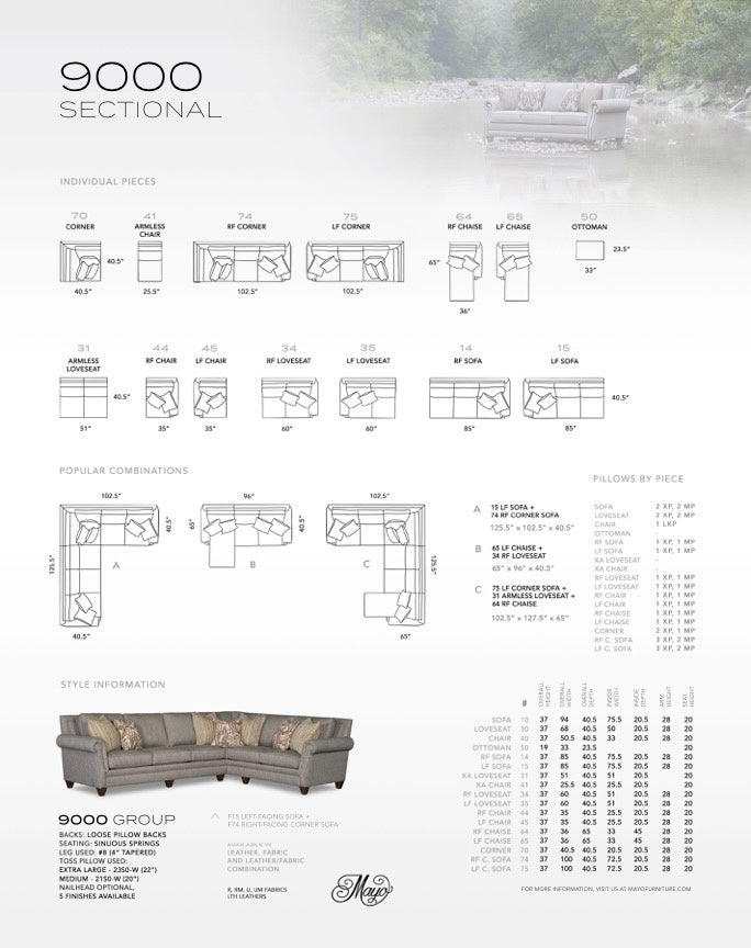 In Stock in - 9000F34: Right Face Sofa, 9000F65: Left Face Chaise, 9000F71: Wedge, 9000F31: Armless Loveseat