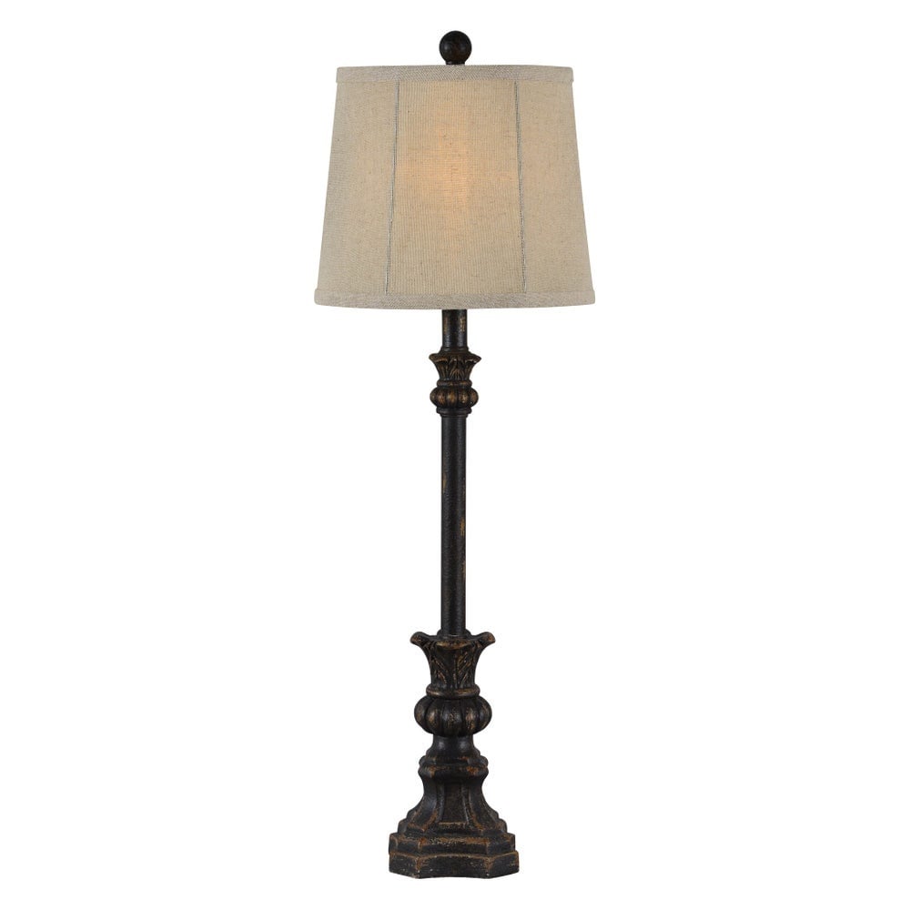 Carlton Buffet Lamp Carlton is a classic, candlestick buffet lamp in hand-cast resin. The base is decorated with the look being hand-carved, featuring a woven cane padded seat and a medium, driftwood finish.