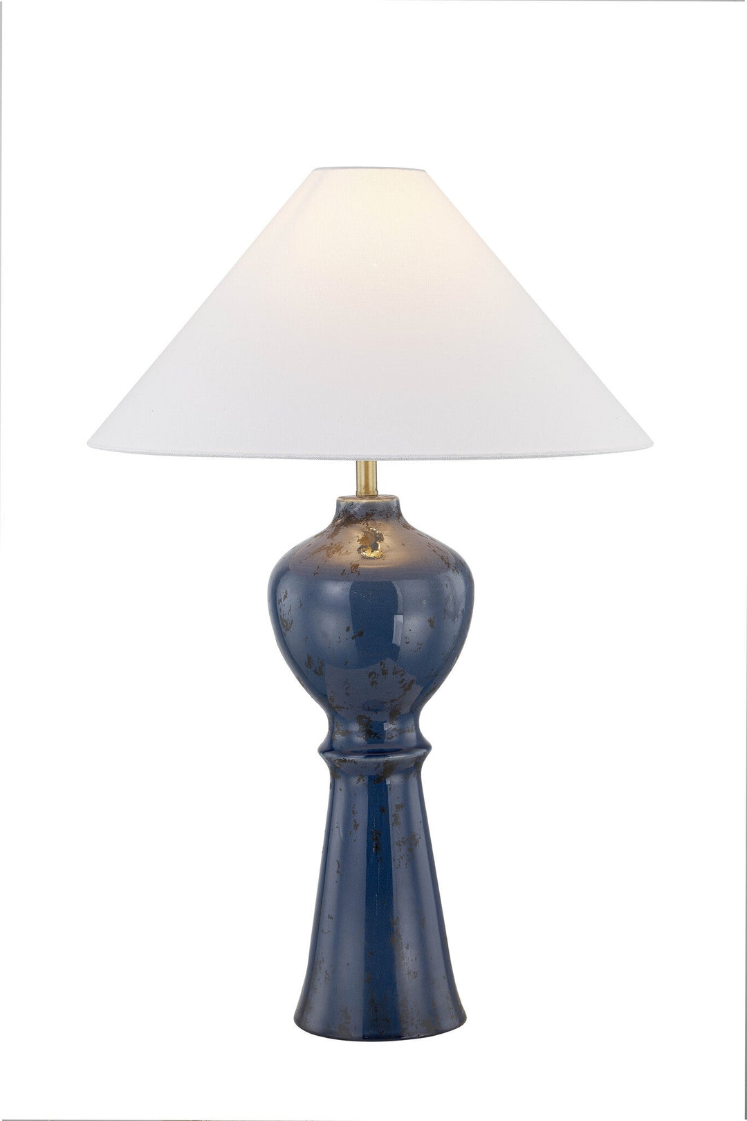 This vintage-inspired ceramic table lamp, elegantly shaped like an elongated vase, boasts a classic cobalt blue color with a lustrous finish. Subtle, intentional brown imperfections in the ceramic enhance its vintage charm. An empire shade and gold hardware add a modern touch, creating a timeless piece that blends tradition with contemporary style.