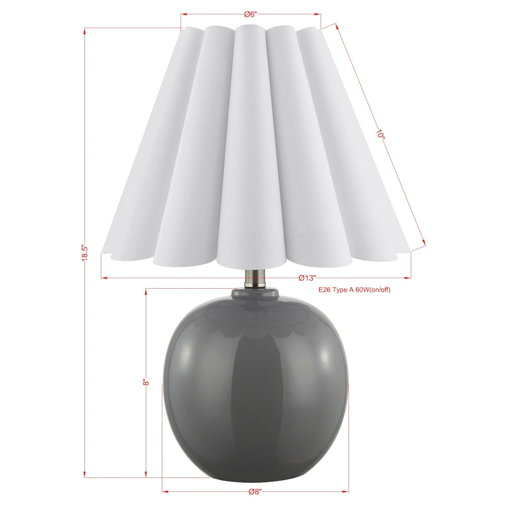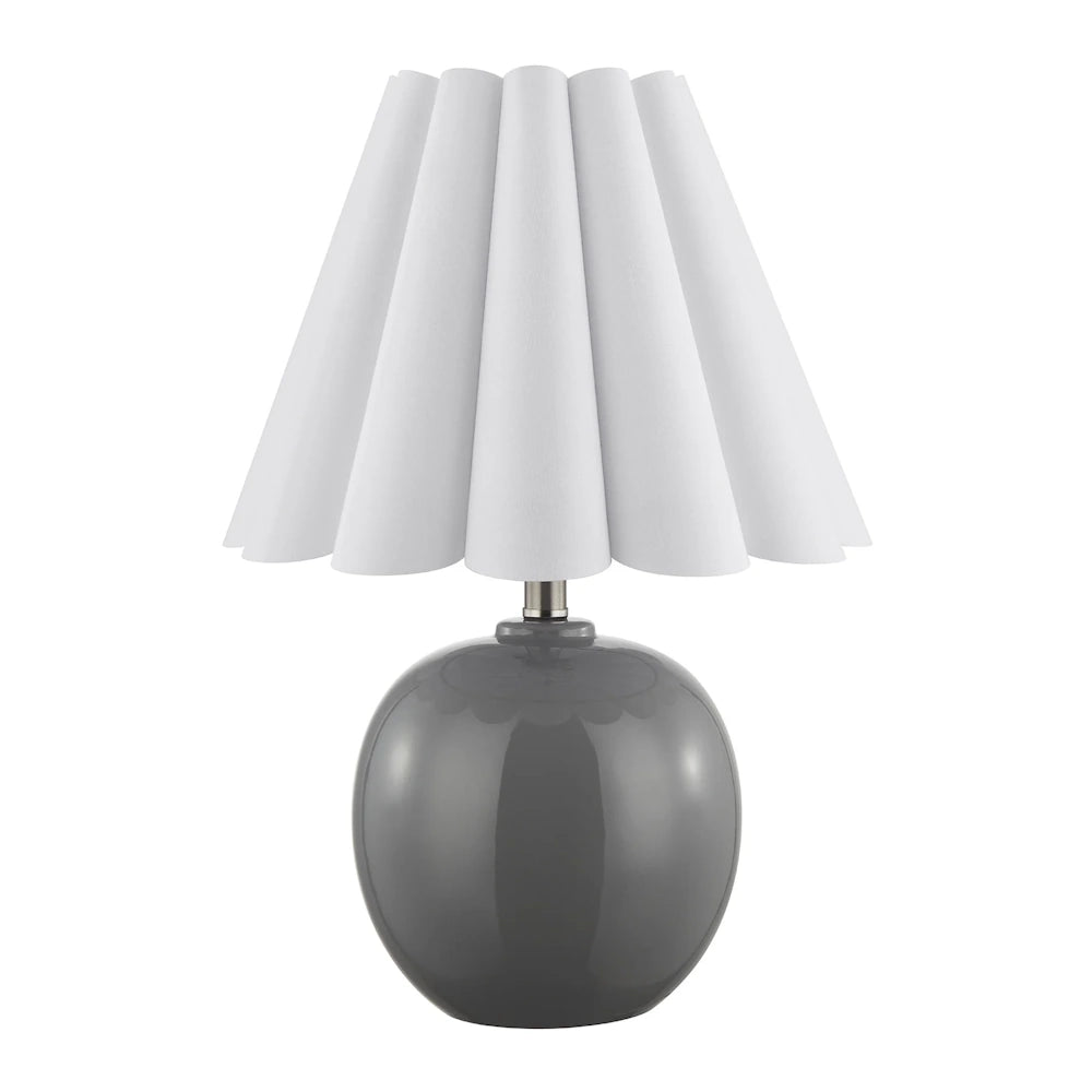 Lake Table Lamp is a clean, glossy gray ceramic formed into a smooth, rounded shape and topped with a pleated white fabric shade.