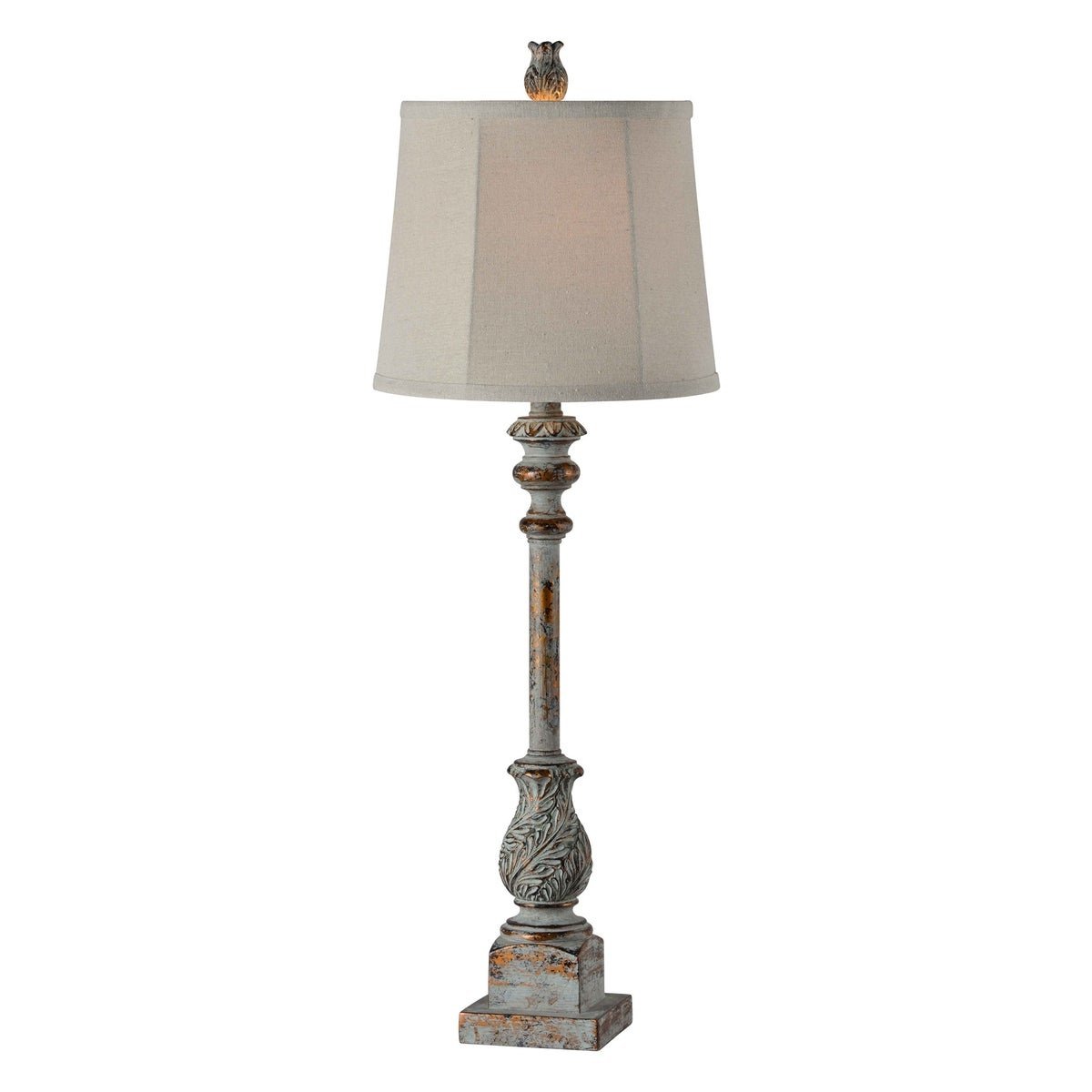 Tilly Buffet Lamp The Tilly Buffet Lamp is an understated yet charming lamp that boasts a vintage blue and bronze finish. The base was intricately designed with acanthus leaves on the bottom and is topped off by a modern white shade.