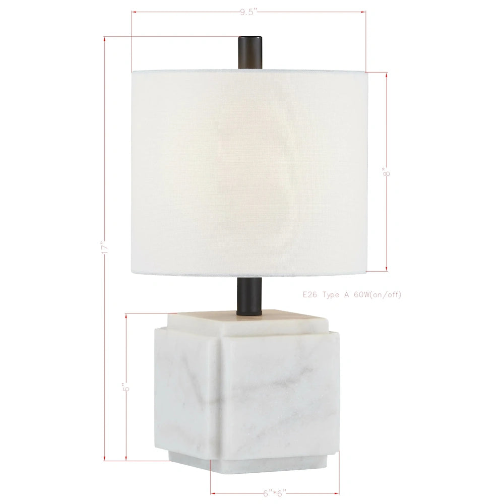 Contemporary look with geometric elements this little guy packs a punch, beautiful white marble with grey veining, matte black hard and finial and lamp neck.