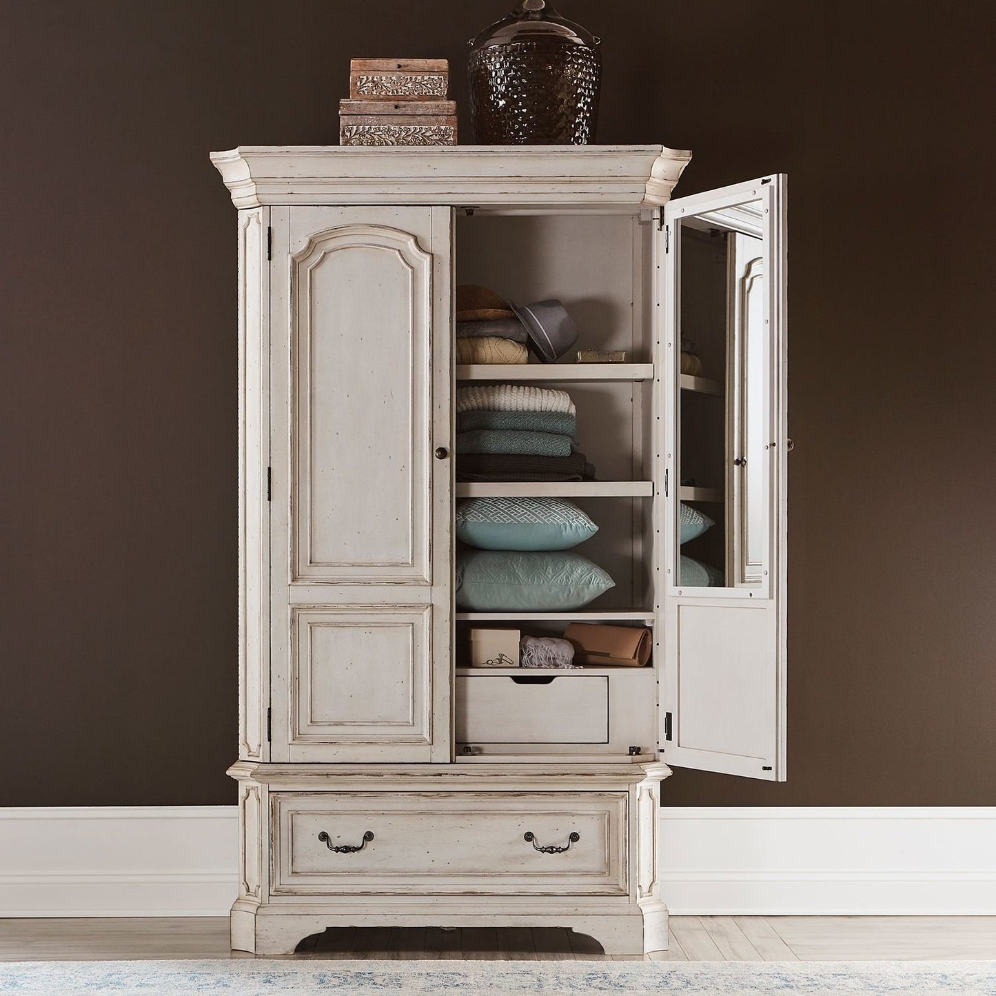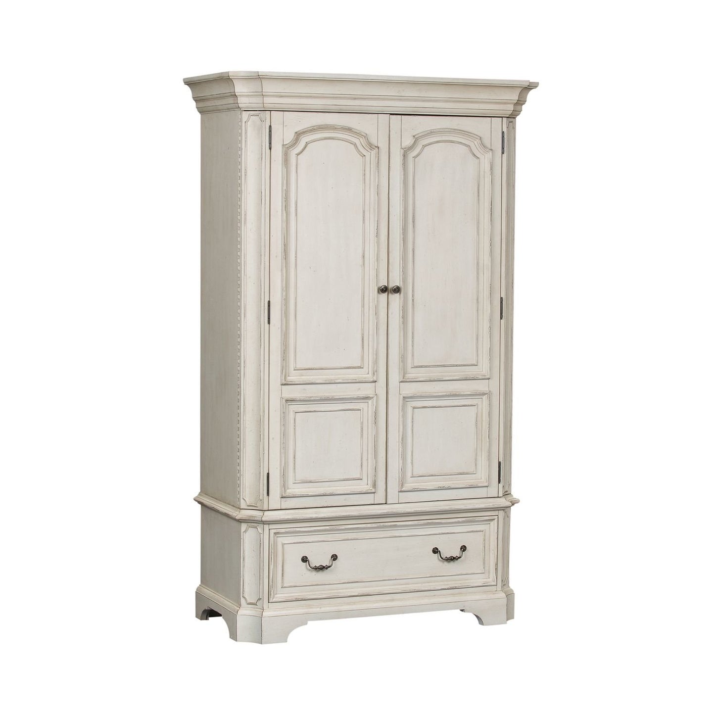 The armoire doors open to reveal a mirror on the inside, as well as adjustable/ removeable shelves, all accented by custom antique pewter bail and knob hardware. The wire management cut outs enable this piece to double as a tv console, optimizing space in your room, appealing to all users.