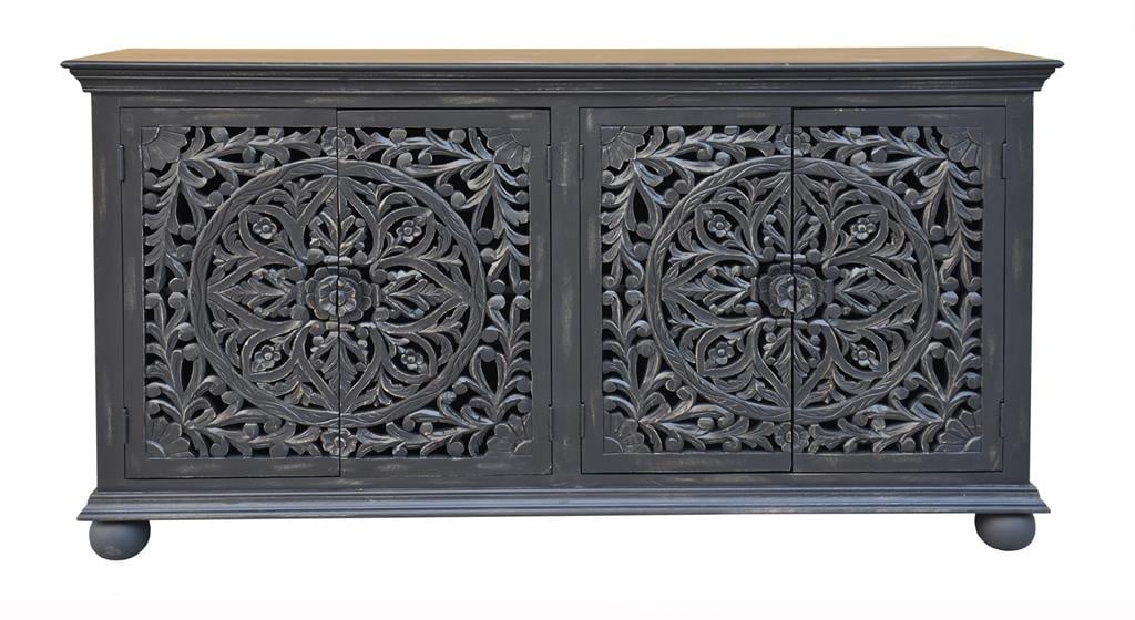 However, it is the intricately carved door fronts that will bring out the oohs and aahs from your friends and family alike, and which will make this credenza an amazing focal point for your eclectic decor.