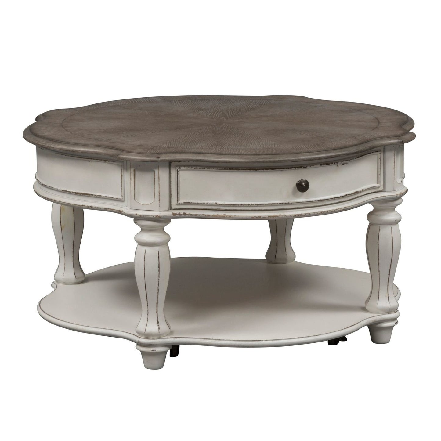 Crafted of poplar solids with white oak and birch veneers, this piece features a weathered brown top with whitewash, unique cloverleaf shape, faceted turned legs, one fully stained interior drawer with full extension drawer glides making access to storage a breeze, fancy face top, casters that make rearranging effortless, framed drawer fronts accompanied by bead molding, and is accented by antique pewter knob hardware. Users can enjoy the added storage for items from magazines, to cozy throw blankets with the bottom shelf. Warm antique finishes and artistic distressing along with grand scale create a piece to be passed to generations.