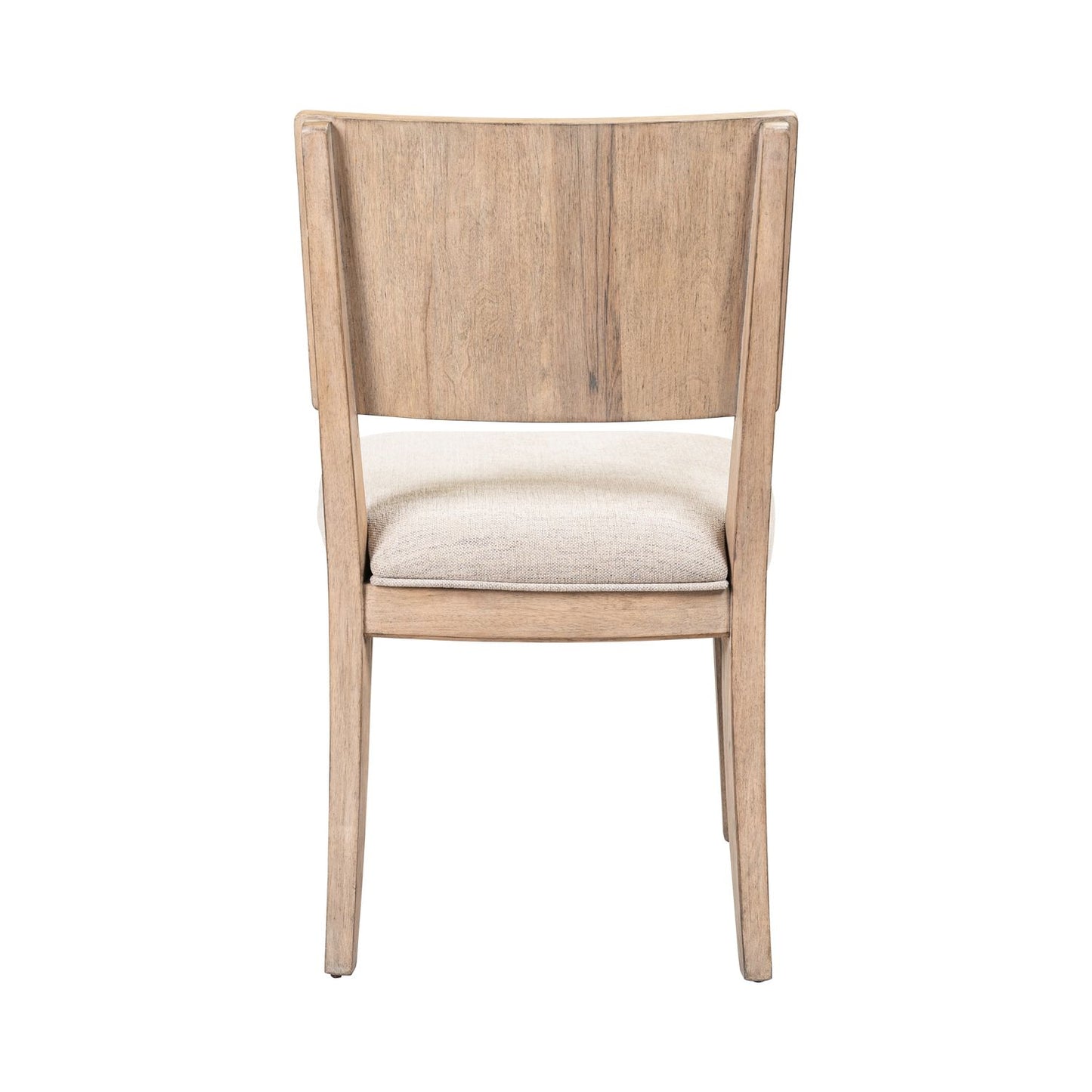 The Proximity Place alternate 7-piece double pedestal table set combines timeless design with modern functionality. Constructed from Rubberwood solids and Rustic Flat Cut Birch veneers in a Barley Buff finish, this set includes a double pedestal table 4 panel back side chairs, and two upholstered side chairs. The table features an 18-inch removable leaf with an Easy Glide leaf track system for effortless expansion, complemented by breadboard veneer ends, soft chamfered edges, and an architecturally styled block leg double pedestal base. The four panel back side chairs feature a Klismos-style panel back, padded seats upholstered in Textured Barley fabric, and square tapered legs with chamfered edges. The two upholstered side chairs feature a softly shaped back with gently sloped side panels for comfort and style. The Textured Barley upholstery adds a refined touch, while the tapered front legs with chamfered edges and saber-style back legs provide a sleek silhouette, all equipped with nylon chair glides to protect your floors . This elegant set is perfect for adding a touch of sophistication to any dining space.