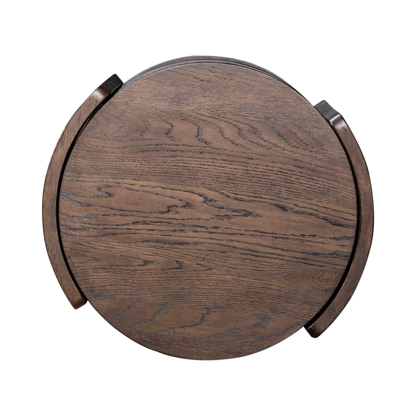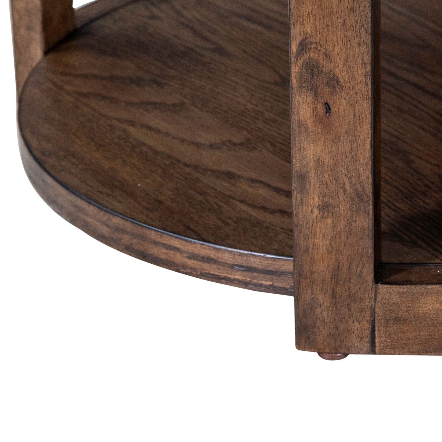 The Warren Park Round End Table brings classic elegance and smart function to your living space. Crafted of Rubberwood solids with Oak veneers in a rich Coffee Brown finish, this table features a rounded silhouette with curved raised end panels in a signature basketweave pattern for added texture and charm. Two open shelves—middle and bottom—offer ample room for storage or display, making it as practical as it is stylish. Whether placed beside a sofa or used as an accent piece, this end table adds warmth and sophistication to any room.