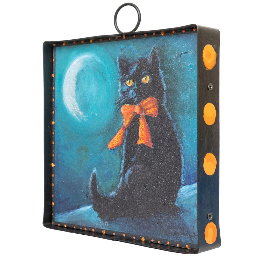 This hand-painted piece features a charming black cat adorned with a festive bow, perfect for bringing playful character to your seasonal décor.
