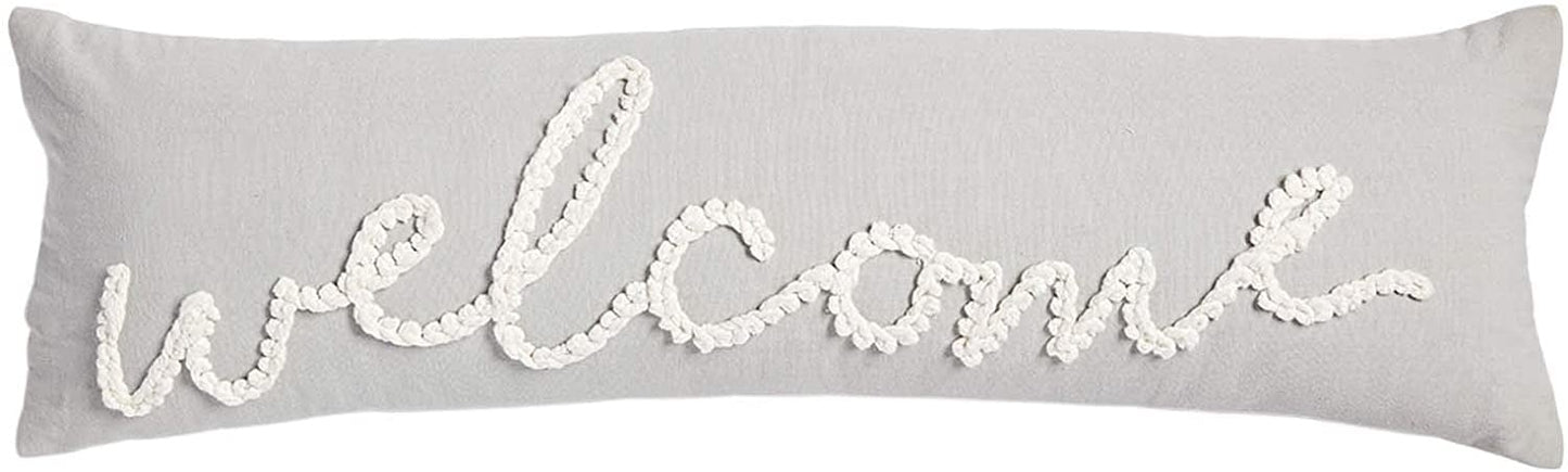 Make a statement with this knot Welcome throw pillow. The long canvas throw pillow features chunky knot sentiment that reads "Welcome". The pillow also has a zipper closure. The throw pillow is gray and the sentiment is knotted in white.