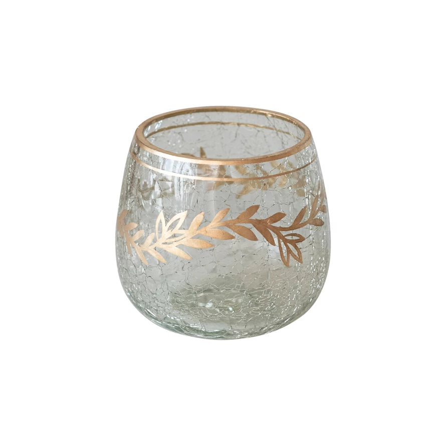 3" Round x 3"H Recycled Glass Tealight/Votive Holder w/ Gold Finish Design, Crackle Finish (Each One Will Vary)