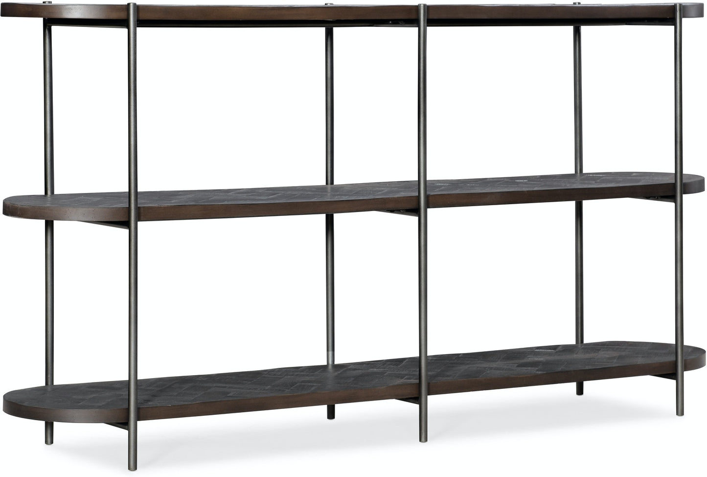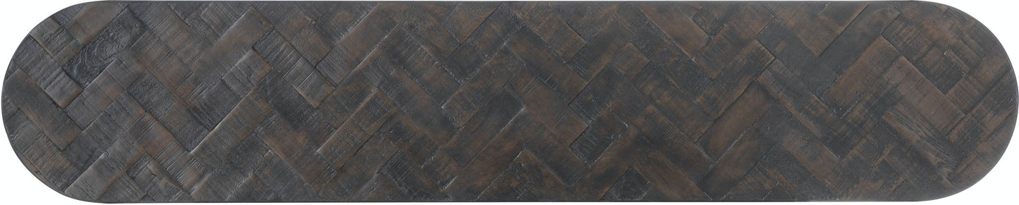 With two fixed shelves and a top made of wood crates in a dark finish, the retro Commerce & Market Console Table has a rustic industrial aesthetic. The carbon steel metal frame is in a graphite gray finish.