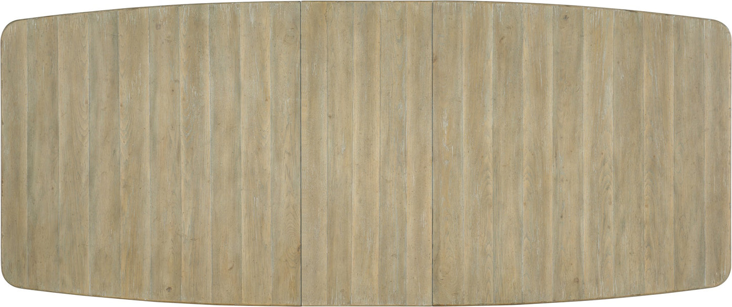 Crafted of Pecan Veneers with a Solid Wood edge top, the table is finished in the light natural Driftwood finish with light distressing including sandblasting and bleaching. Featuring one 18-inch leaf, the table extends to 100 inches long with the leaf in place to accommodate up to 2 arm chairs and 8 side chairs. Without the leaf, it accommodates up to 2 arm chairs and 6 side chairs. Melding the salty, yet cozy oasis of the California coastline with a modern surf culture, Surfrider is defined by the use of natural materials including rattan, jute rope, stone, gypsum, bamboo and driftwood motifs. Designed to create relaxing spaces to escape from the pressures of modern life, it is featured in a light, natural Driftwood finish. Luxurious materials, shapes and textures combine to create a relaxed, yet sophisticated style that epitomize the lifestyle of a casual, beach-town community.