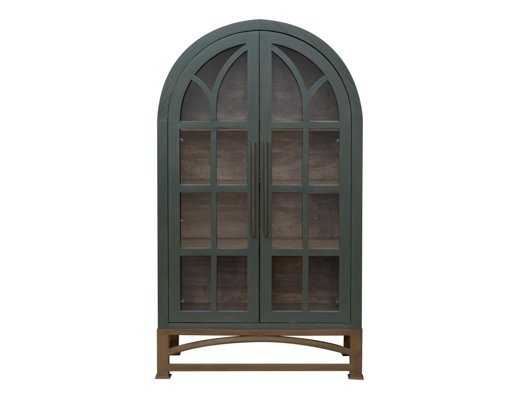 Crafted from lightly distressed pine wood and elegantly set within a metal base, this cabinet features a beautifully paneled oval glass door, making it a timeless addition to your home.