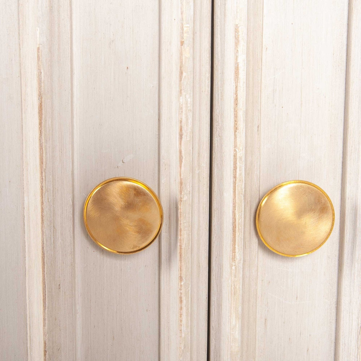 It includes four spacious cabinets with center shelves, offering ample storage for dining essentials, entryway items, or other belongings. Handmade from solid Bayur Wood with an antique white finish and gold hardware, the kiln-dried construction ensures durability and longevity.
