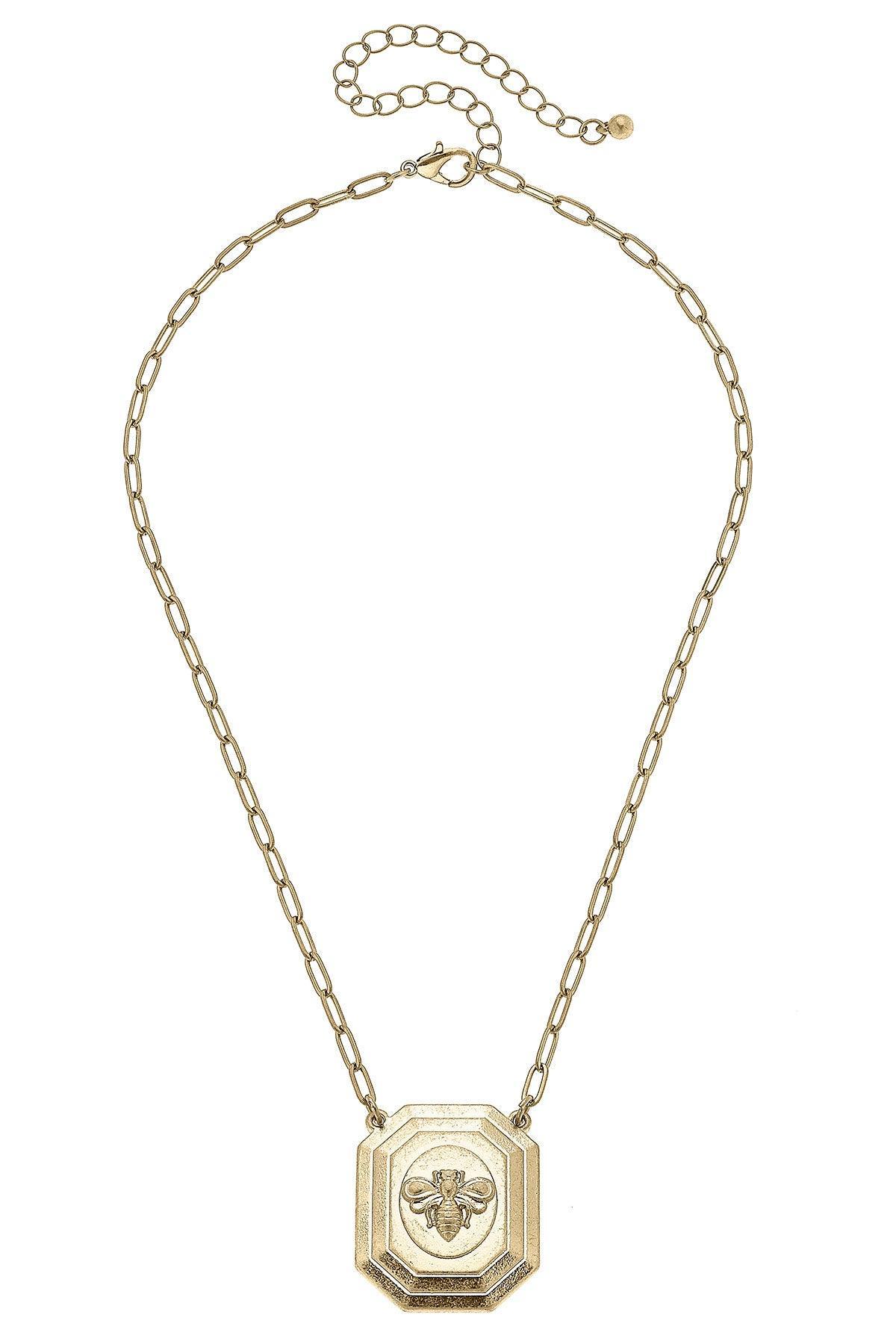 Make a statement with our stunning Queen Bee Necklace in Worn Gold. Crafted with intricate detailing, this necklace is perfect for adding a touch of elegance to any outfit. Show off your unique style with this beautiful piece.