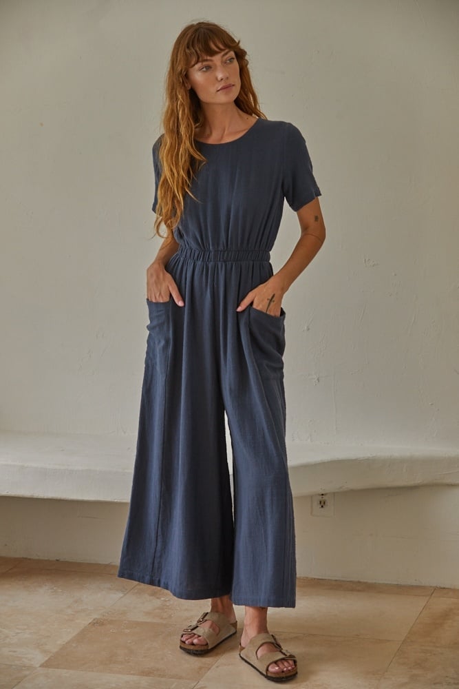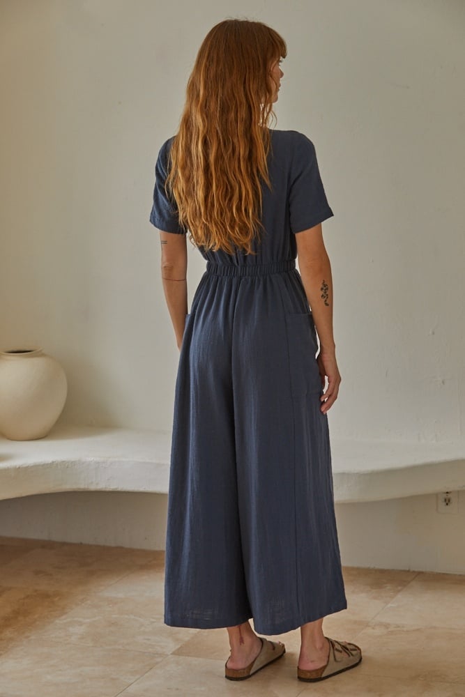 Woven Cotton Garment Washed Round Neck Short Sleeve Wide Leg Jumpsuit With Elastic Waist Band Back Slit Back Button And Side Pockets