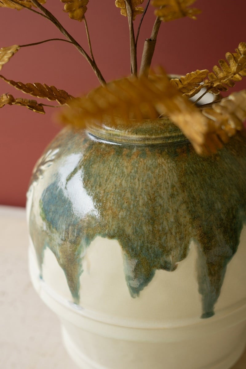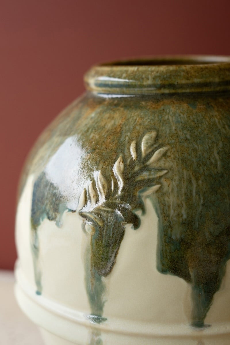 Olive this jar. Squeeze the day with this large ceramic olive jar with an olive green spill over the top and a natural base. This jar suits any kitchen or craft area empty or full of blooms.