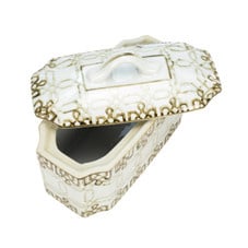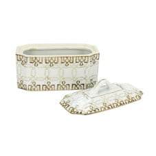 The decorative box sports a brown and white palette, featuring hand-painted exterior designs with overlapping lines that exude an old-world appeal. The piece features a removable lid with a curved handle for effortless usage. With a measurement of 8L x 4W x 6H, it's just the right size to hold your treasured trinkets.