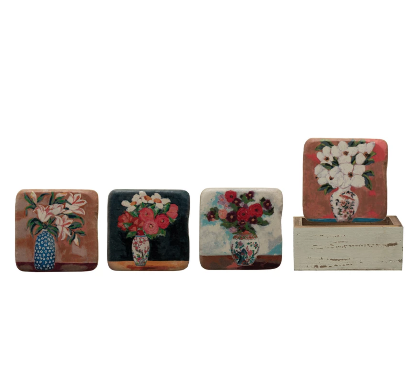 Resin Coasters with Flowers in Vase in Wood Box