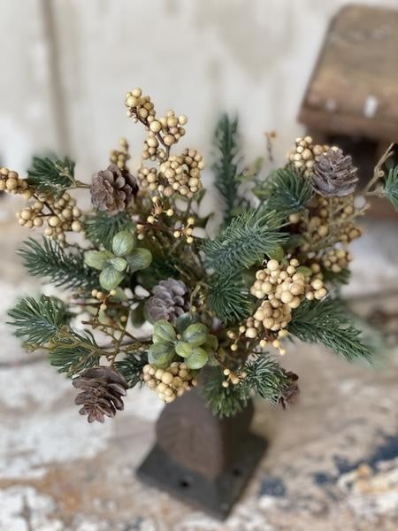 A wonderful assembly of spruce and greenery, pine cones, bubble berries and branching accents.