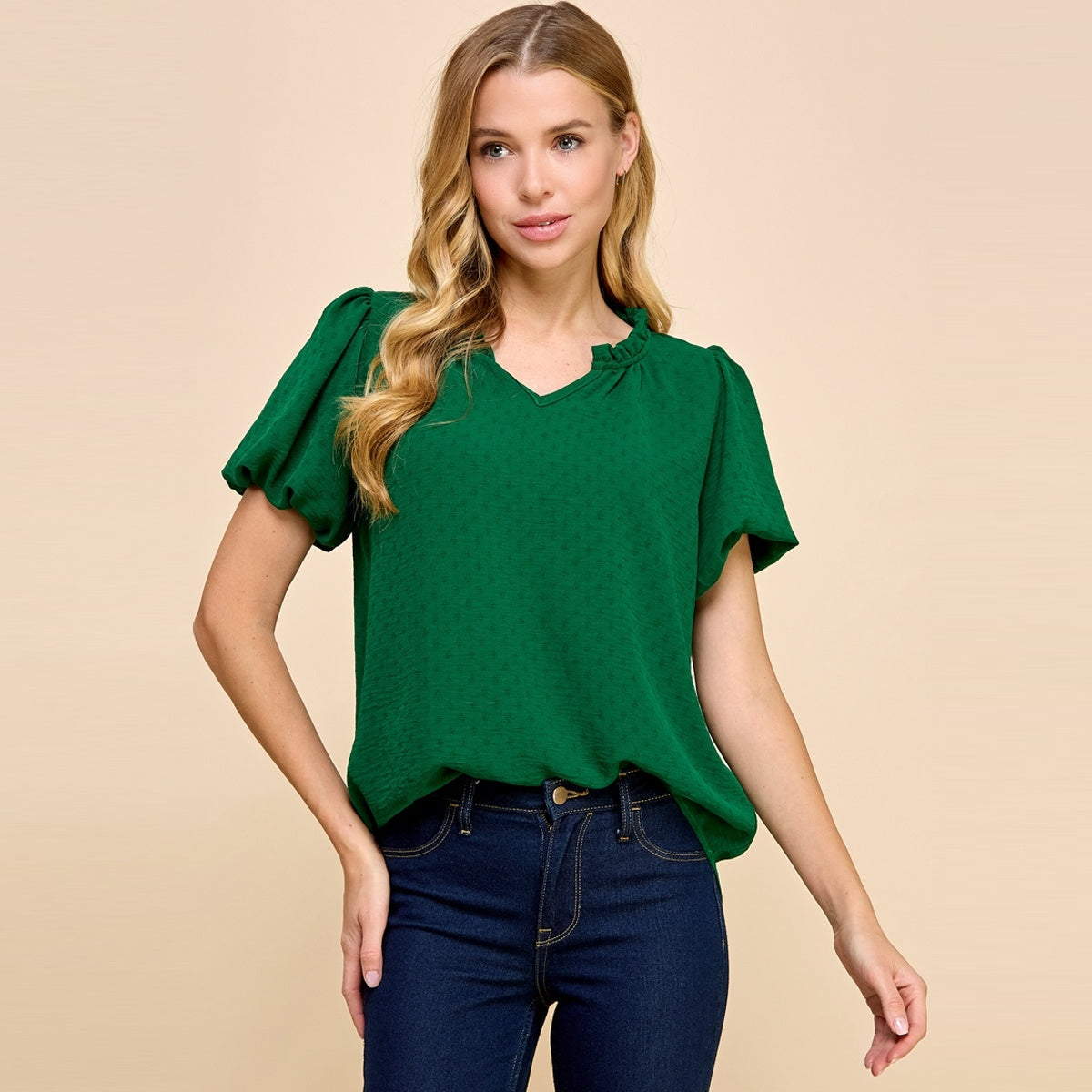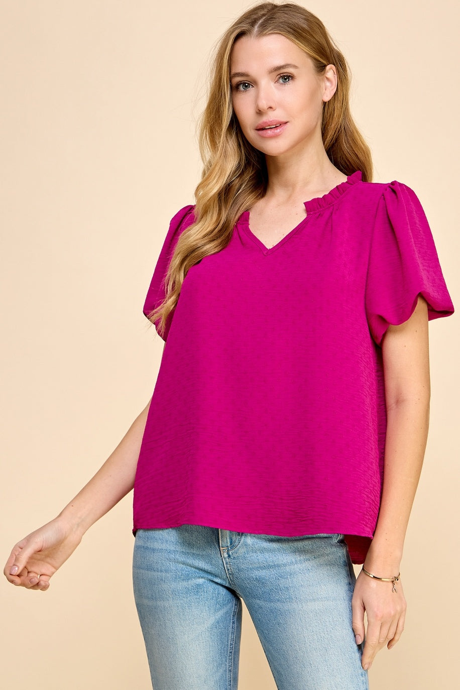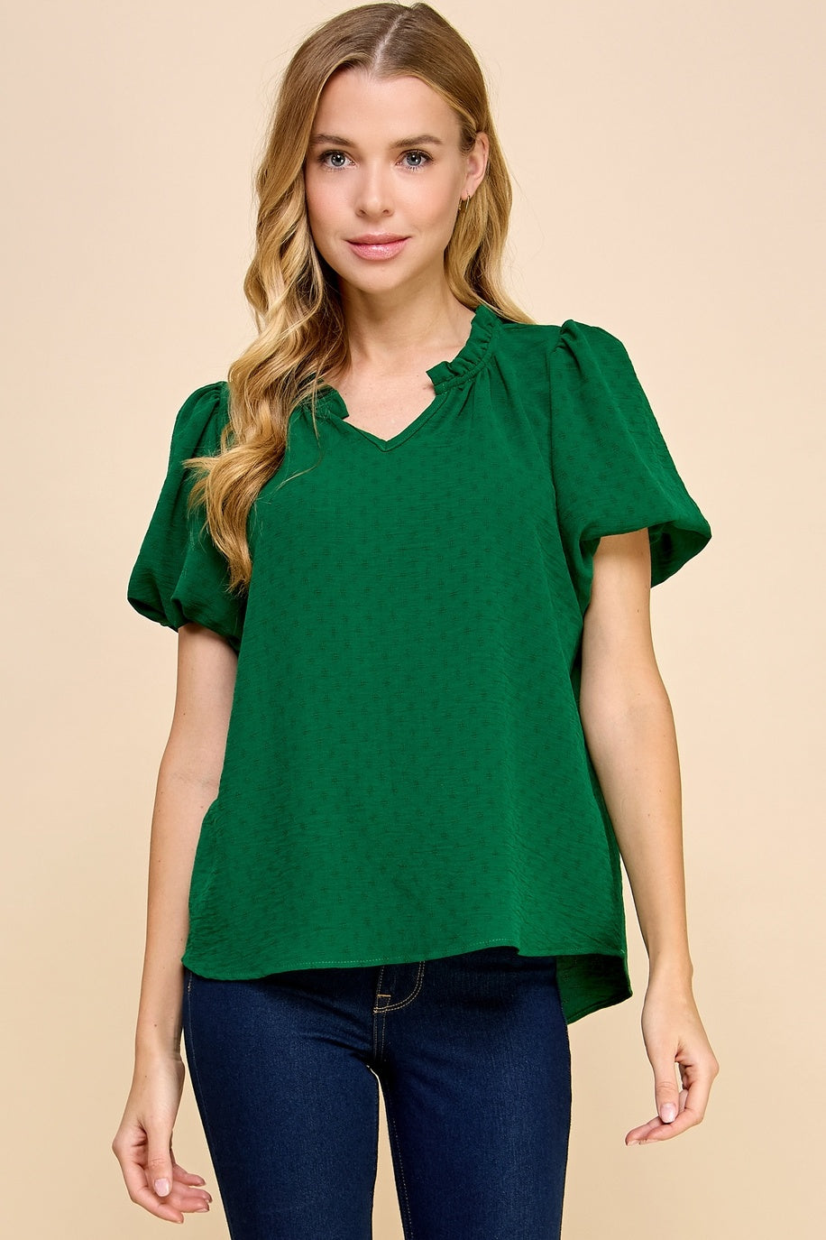 Our Solid Textured Air Flow Top, an absolute must-have for your wardrobe! This stunning top boasts a beautiful ruffled V-neck detail and puffed sleeves to add a touch of elegance to your everyday style.