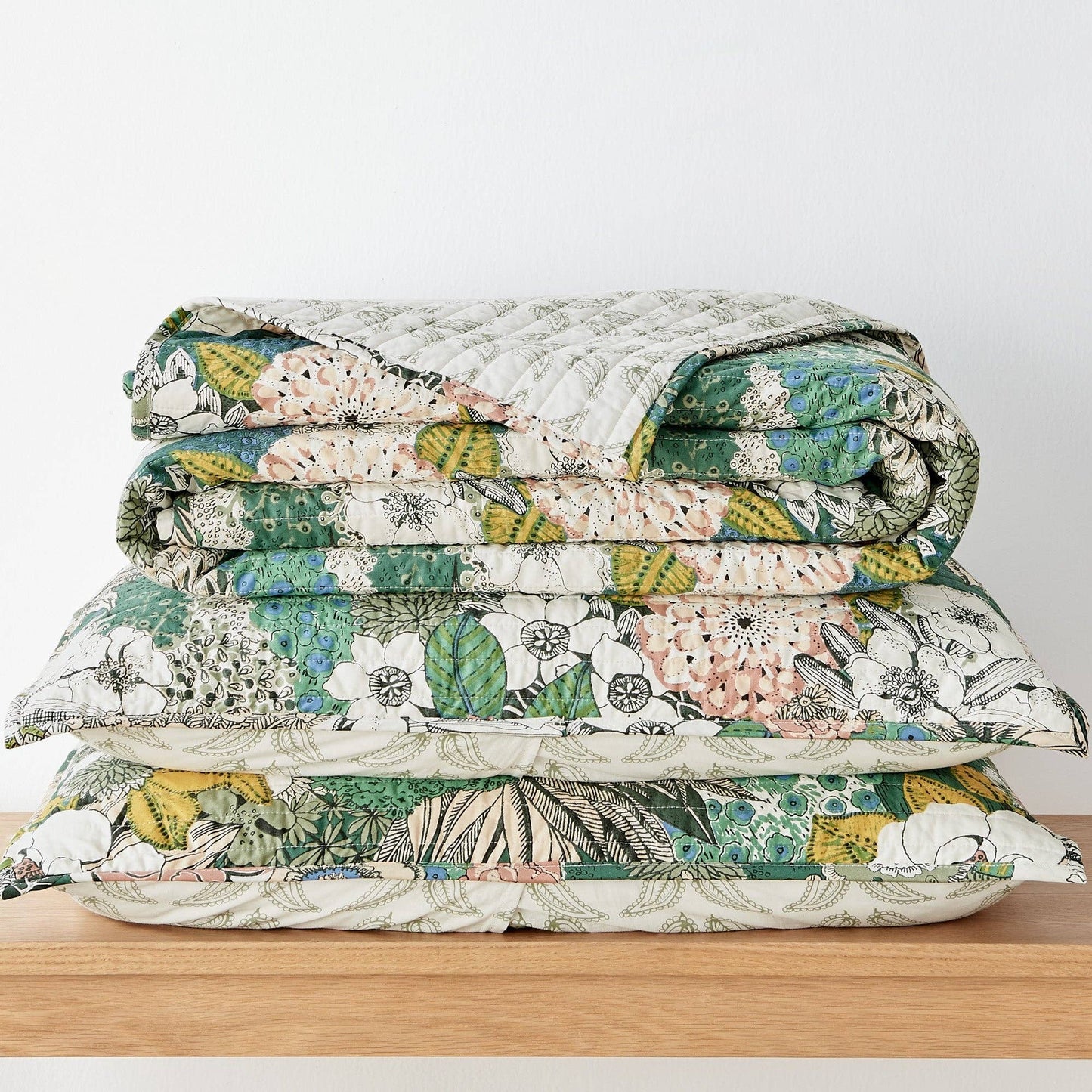 The Bettina Reversible Quilt Set by Levtex Home is inspired by a colorful blooming garden. Offered in teal, blue, green, mauve and cream, this design will immediately transform your bedroom. This reversible quilt features beautiful floral print on the front, reversing to a green outlined leaves on a cream ground on the back. The Quilt Set has a cotton front and back, filled with a cotton-rich filler, and are machine washable. Enjoy this for years to come!