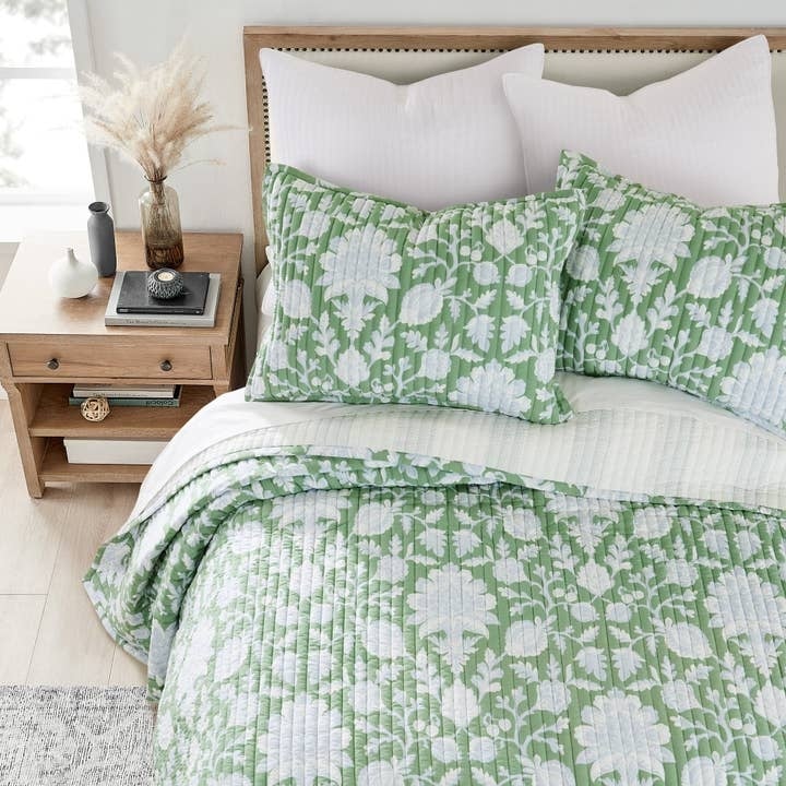 This reversible quilt features a romantic aray of botanical flowers in white and blue on a green ground on the front, reversing to a blue dot stripe on a white ground on the back. The quilt set has a rayon front and cotton back, filled with a cotton-rich filler and are machine washable. Enjoy this for years to come!
