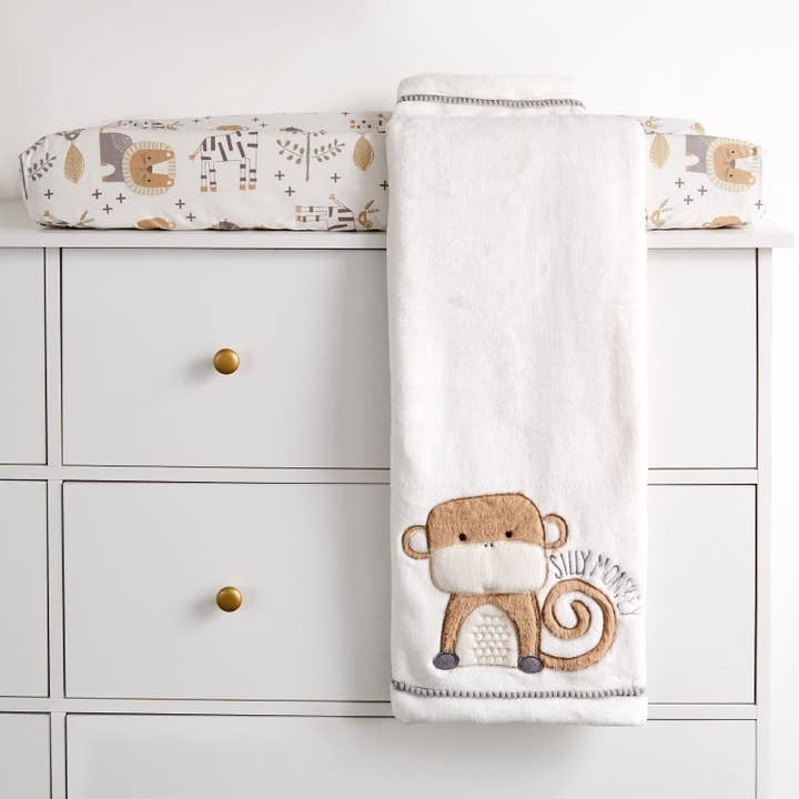 Wrap your baby up in warmth and comfort with the Levtex Baby Kenya Blanket. This item features a cute and friendly monkey embroidered at the bottom of the blanket, with the words SILLY MONKEY above the tail.