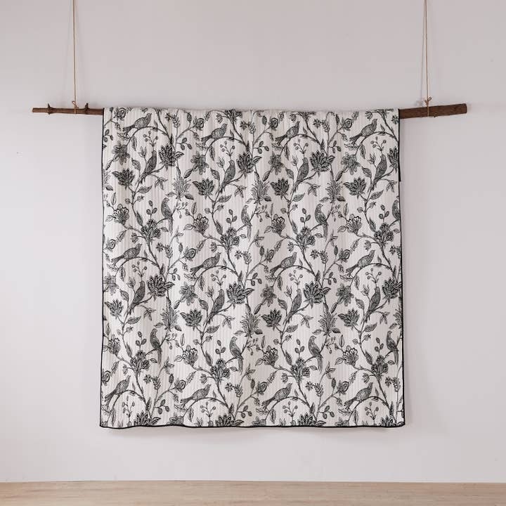Made with the softest lightweight cotton, this reversible quilt features intricately detailed flowers and birds on the one side, reversing to a black and white stripe on the other. The Quilt Set has a cotton rich filler (90% cotton, 7% rayon, 3% other fibers) and is machine washable and includes the quilt (68x86in.) and one standard pillow sham (26x20in.) Enjoy this for years to come!
