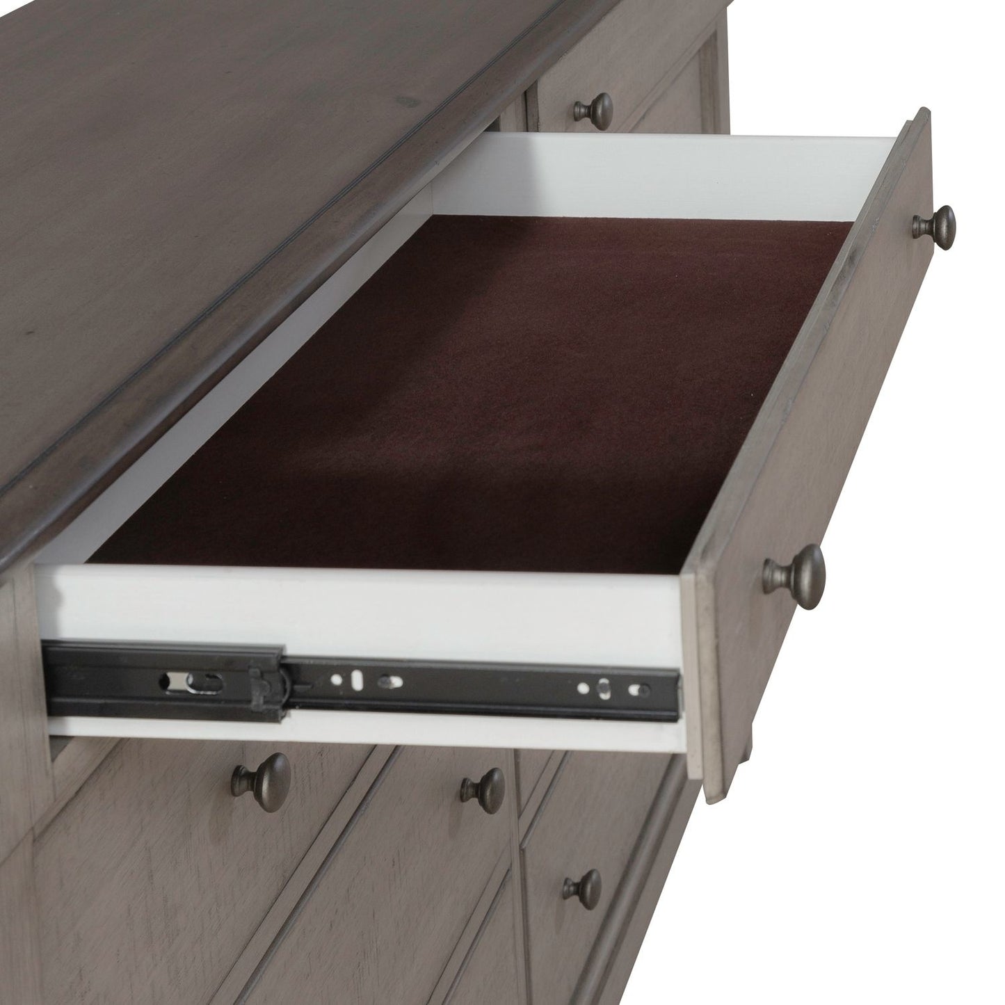 This dresser offers nine full extension drawers with premium felt lined top and cedar lined bottom drawers. The top drawers are offset for added dimension which flow into tapered feet. Framed end panels create a nice side view. Pin nail accents and antique pewter knob hardware add character to the front of the case. Inviting and inspirational, Ivy Hollow offers a look and design style that works for cottage or contemporary and is more about creating a look that we love.