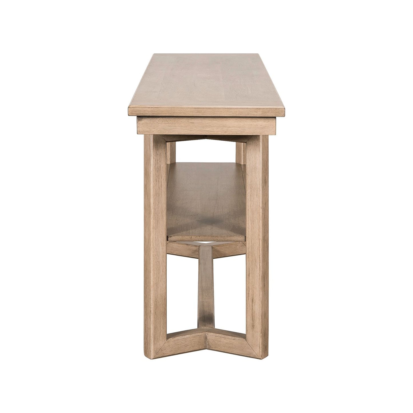 The Proximity Place Sofa Table blends architectural character with everyday functionality. Crafted of Rubberwood solids and Rustic Flat Cut Birch veneers in a warm Barley Buff finish, this table showcases a striking silhouette with intersecting block legs and soft chamfered edges for a refined, sculptural look. A spacious open fixed center shelf offers the perfect spot for displaying books, baskets, or décor, making this table a versatile addition behind a sofa or along a hallway wall. Simple, bold, and full of purpose—Proximity Place makes a subtle statement.