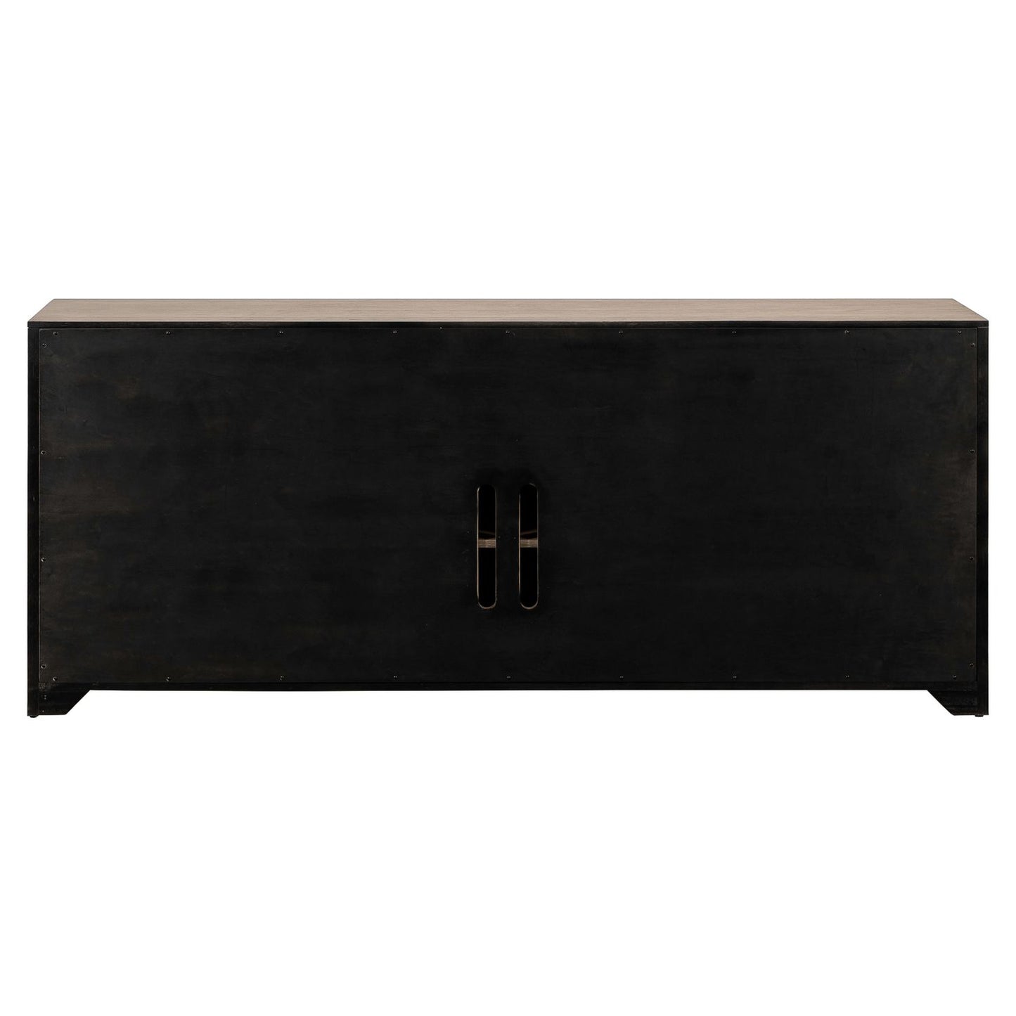 Bring style and functionality to your entertainment space with the Proximity Place 82 inch TV Console. Crafted of Rubberwood solids with Rustic Flat Cut Birch veneers, this console showcases picture frame molding and soft chamfered edges that flow seamlessly into sturdy block feet. The top features two smaller drawers flanking a larger center drawer, all with flat-cut fronts for a clean, modern look. Below, four wood-framed doors with magnetic catches provide easy access to storage. Behind each outside door is an adjustable wood shelf, while the center doors open to reveal a spacious shelf and built-in wire management—perfect for keeping electronics organized and out of sight.