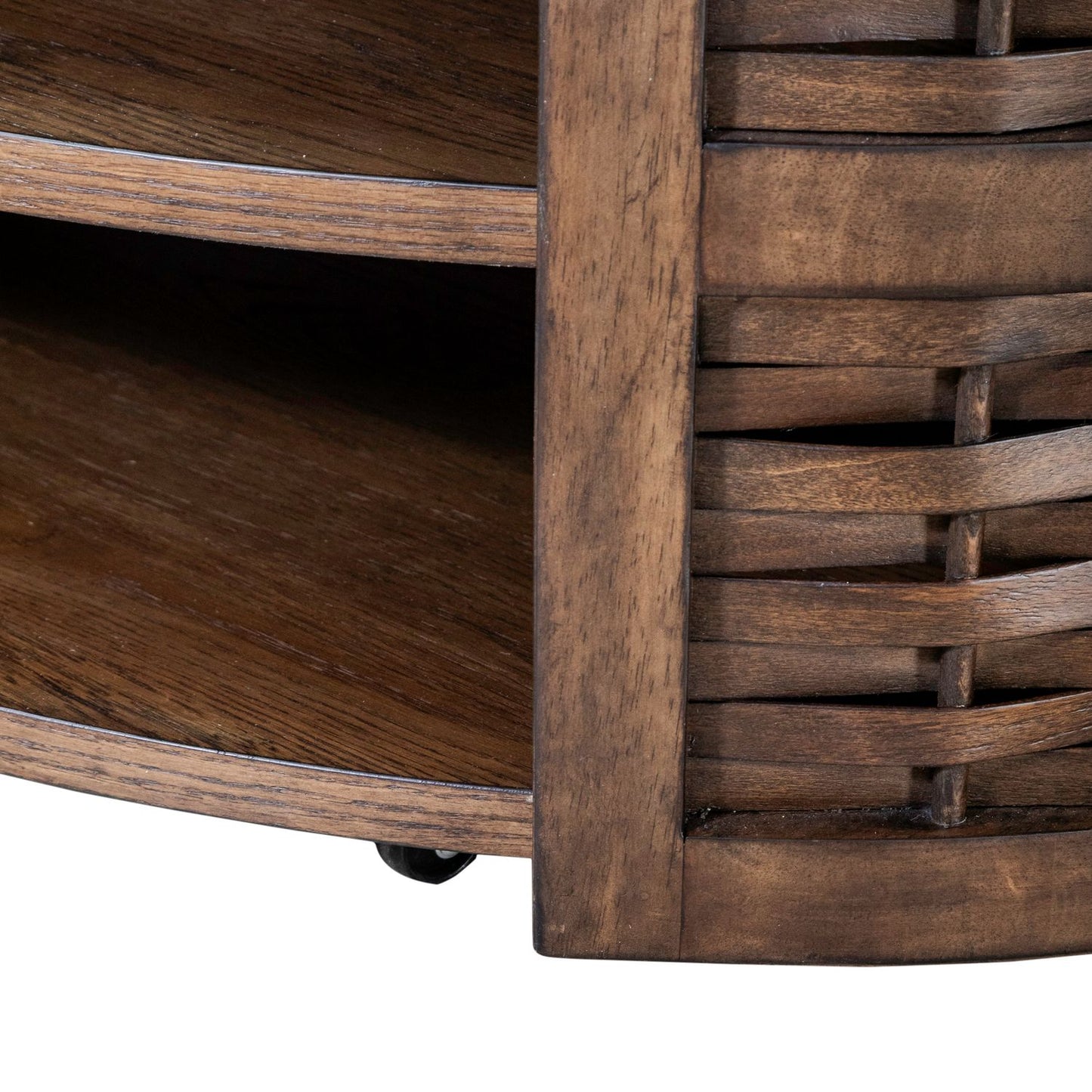 The Warren Park Oval Cocktail Table brings graceful elegance and practical design to your living space. Crafted of Rubberwood solids with Oak veneers in a rich Coffee Brown finish, this cocktail table showcases a soft oval shape that adds flow and warmth to any room. Distinctive curved raised end panels feature a unique basketweave pattern, giving the piece a subtle textural charm. Designed with both style and storage in mind, the table includes an open middle and bottom shelf—perfect for displaying décor or keeping everyday items within reach. Hidden casters provide effortless mobility, making this table as functional as it is beautiful.