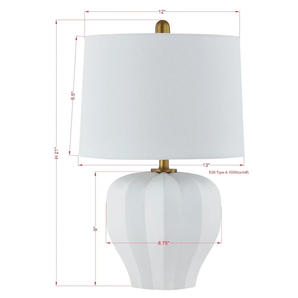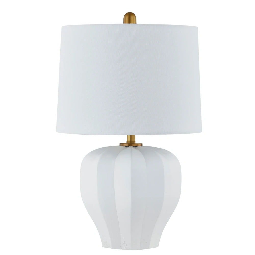 This statement-making lamp features a white cement base shaped in soft petal-like fluting, paired with warm brass-finished metal accents and a crisp white drum shade that diffuses a gentle ambient glow.