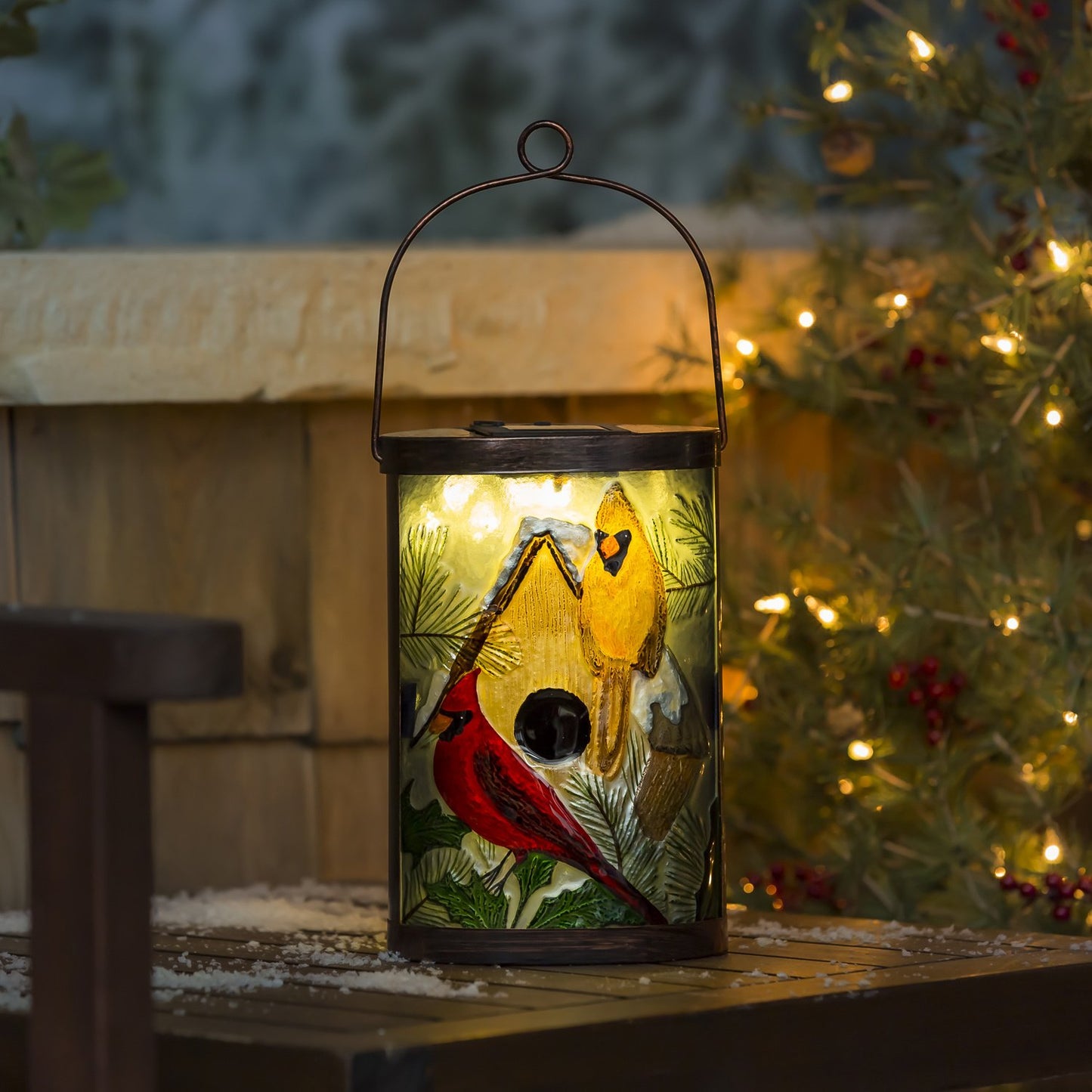 Handpainted Solar Glass Lantern, Winter Cardinal Couple