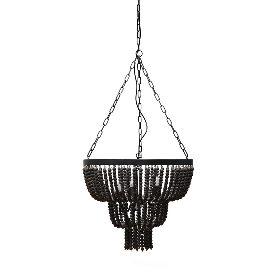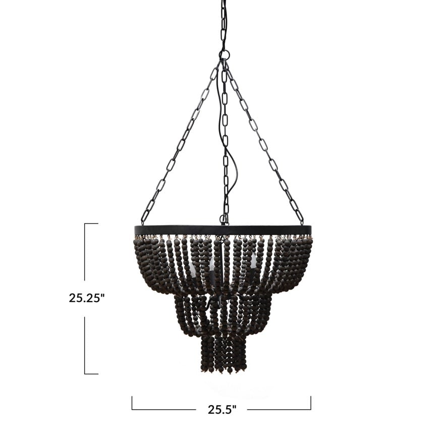 25-1/2" Round x 25-1/4"H Metal & Wood Bead Chandelier w/ 3 Lights, 6' Chain & 10' Cord, Black (40 Watt Bulb Maximum, Hardwire Only)