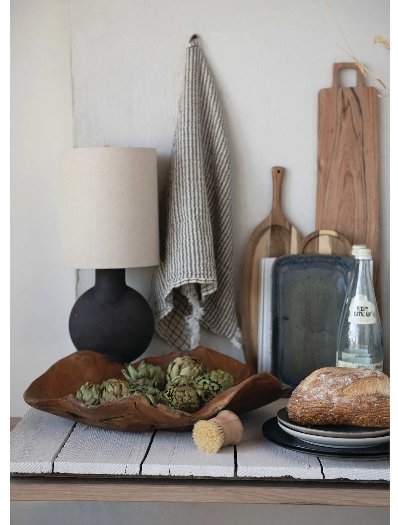 Add a fresh touch to the room decor with this terracotta table lamp. The uniquely shaped black base will delight as it complements the linen drum shade. Add it to a side, console or sofa table and lighten the whole room with its charm.