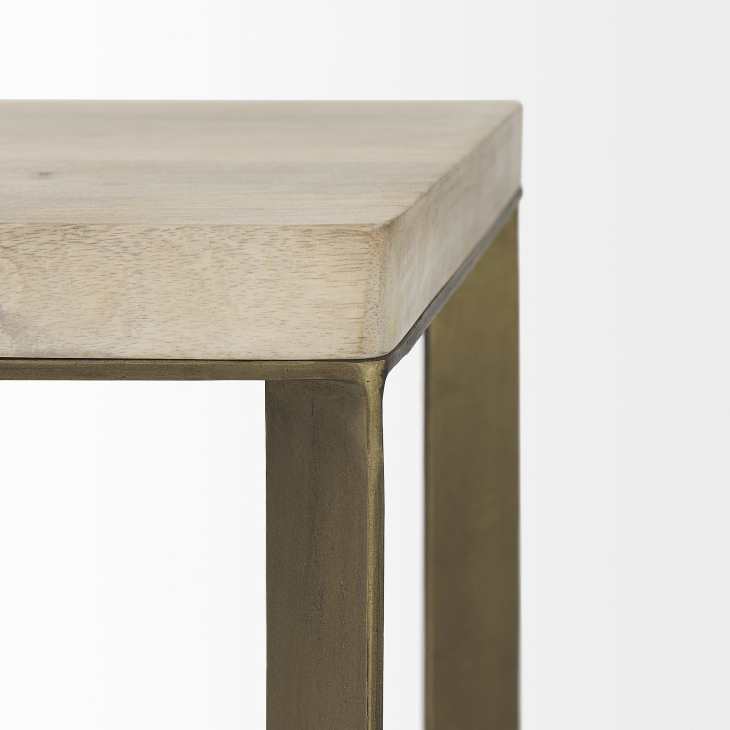 The light brown wood is smooth textured with a washed finish that lets its gray undertones and natural character show through. The iron bases feature a subtle, antique gold finish.