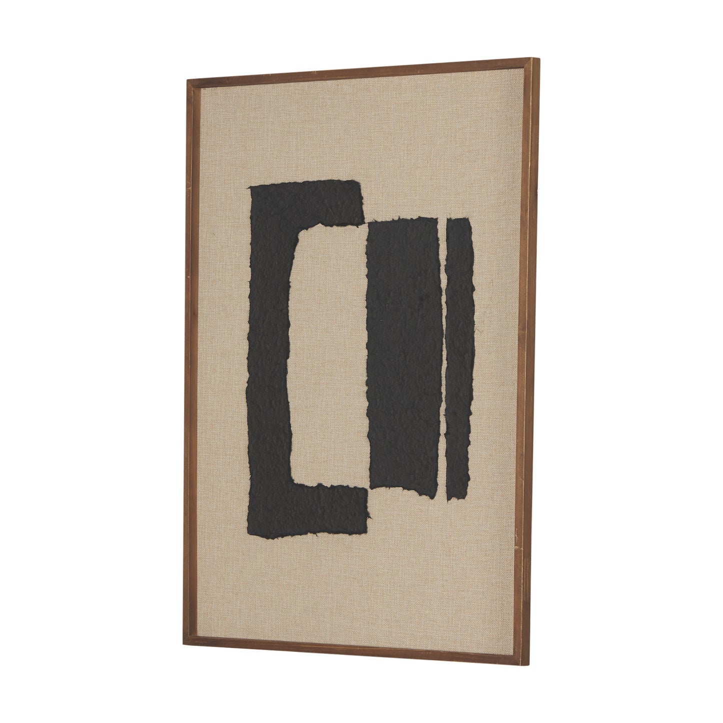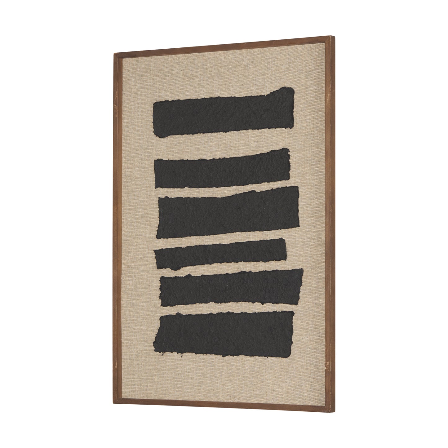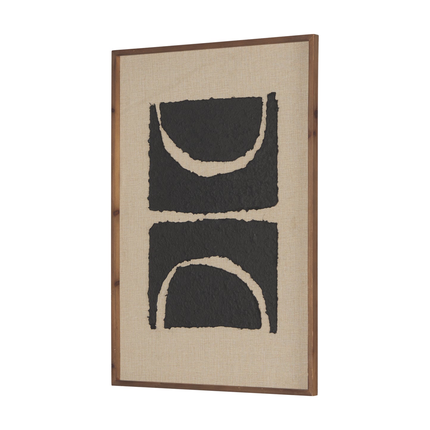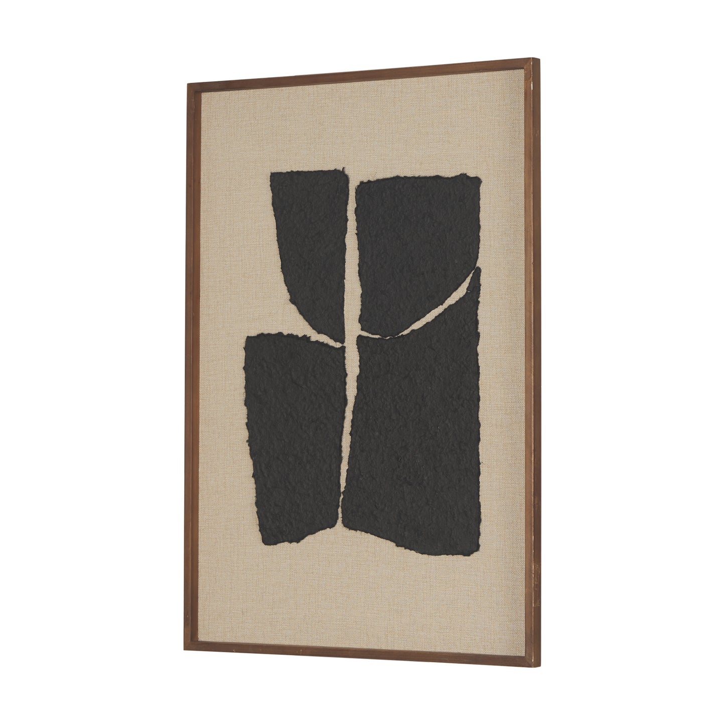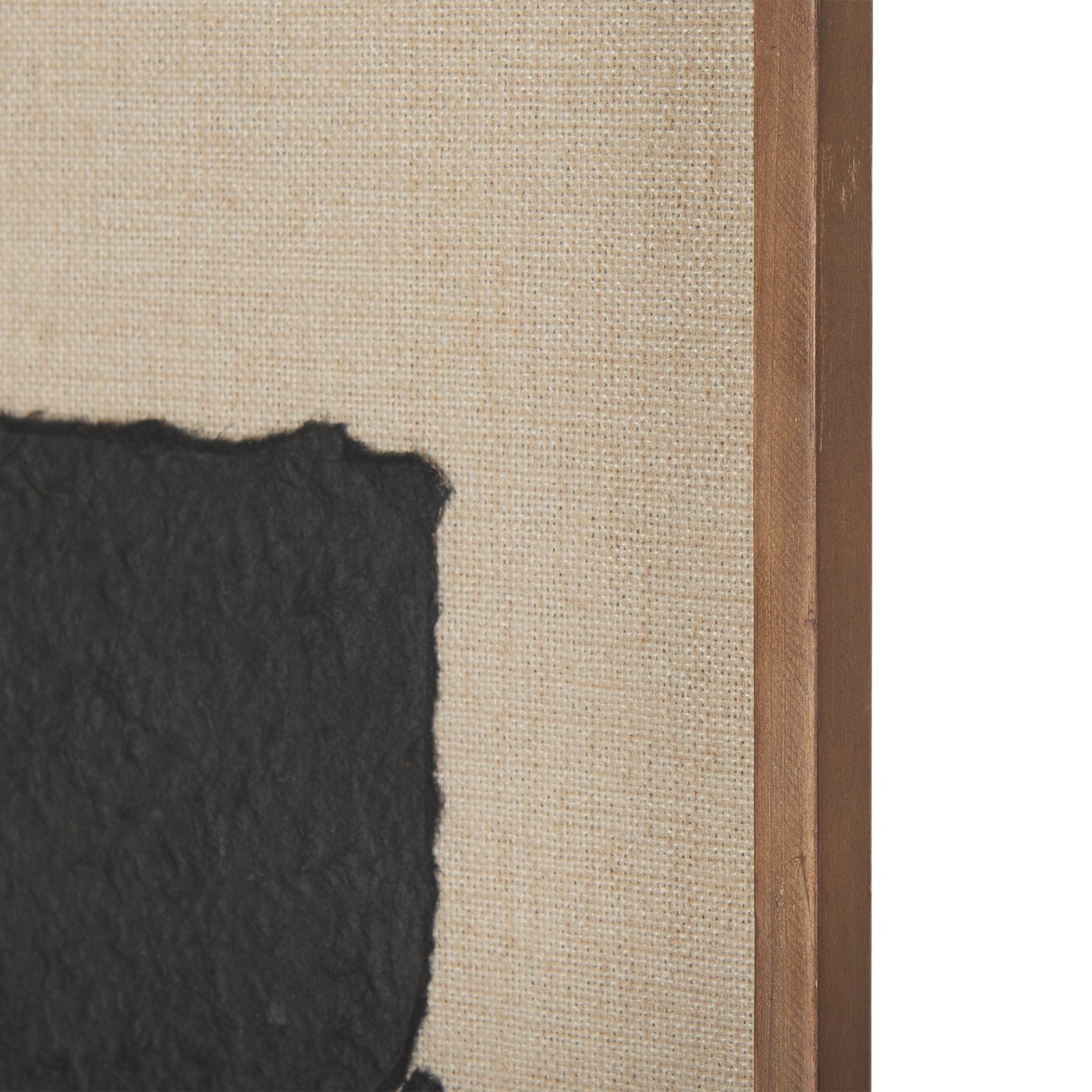 A set of 4 pieces of wood-framed art featuring organic, textured paper. The black paper shapes against the natural woven background create a beautiful contrast that will add a bold statement to a space.