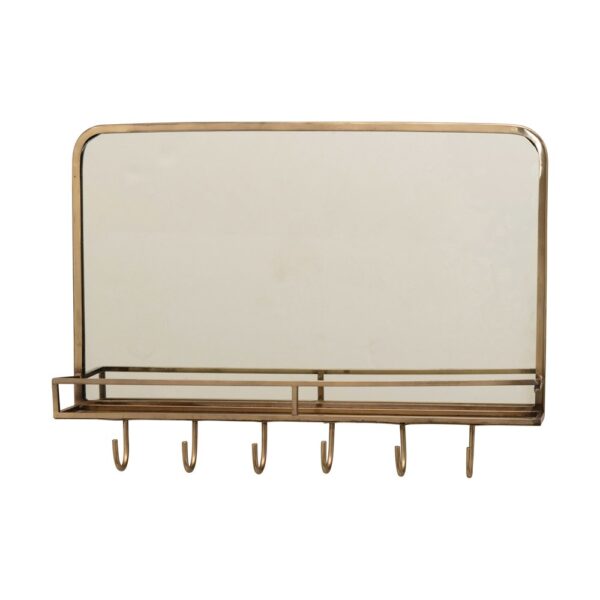 Metal Framed Wall Mirror w/ Shelf & 6 Hooks, Brass Finish